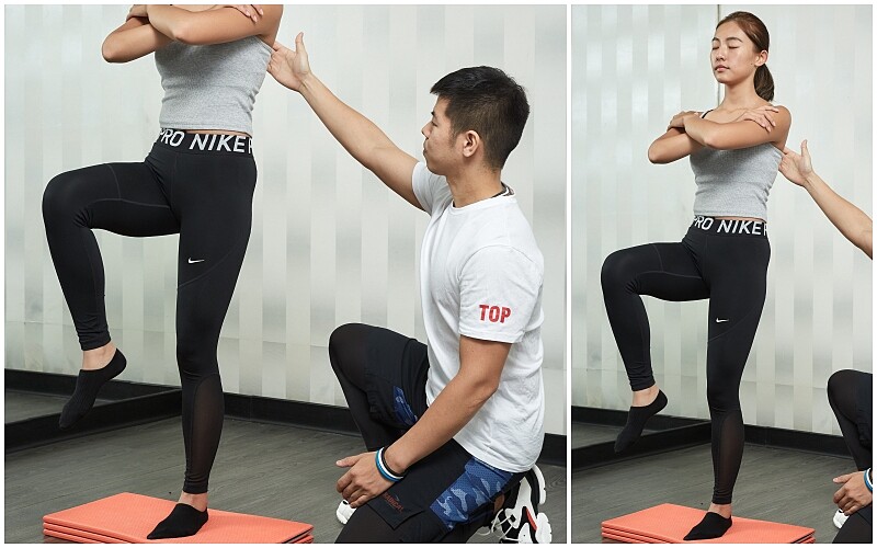 掌握核心穩定訣竅後,就可以視身體狀況,加快速度或是增加手部、抬腿等不同動作來提高運動強度,經過教練現場指導教學,M編身體出汗速度立刻加快,做出肢體動作同時,還需要同時穩定核心不晃動,運動強度馬上又提升一個等級!