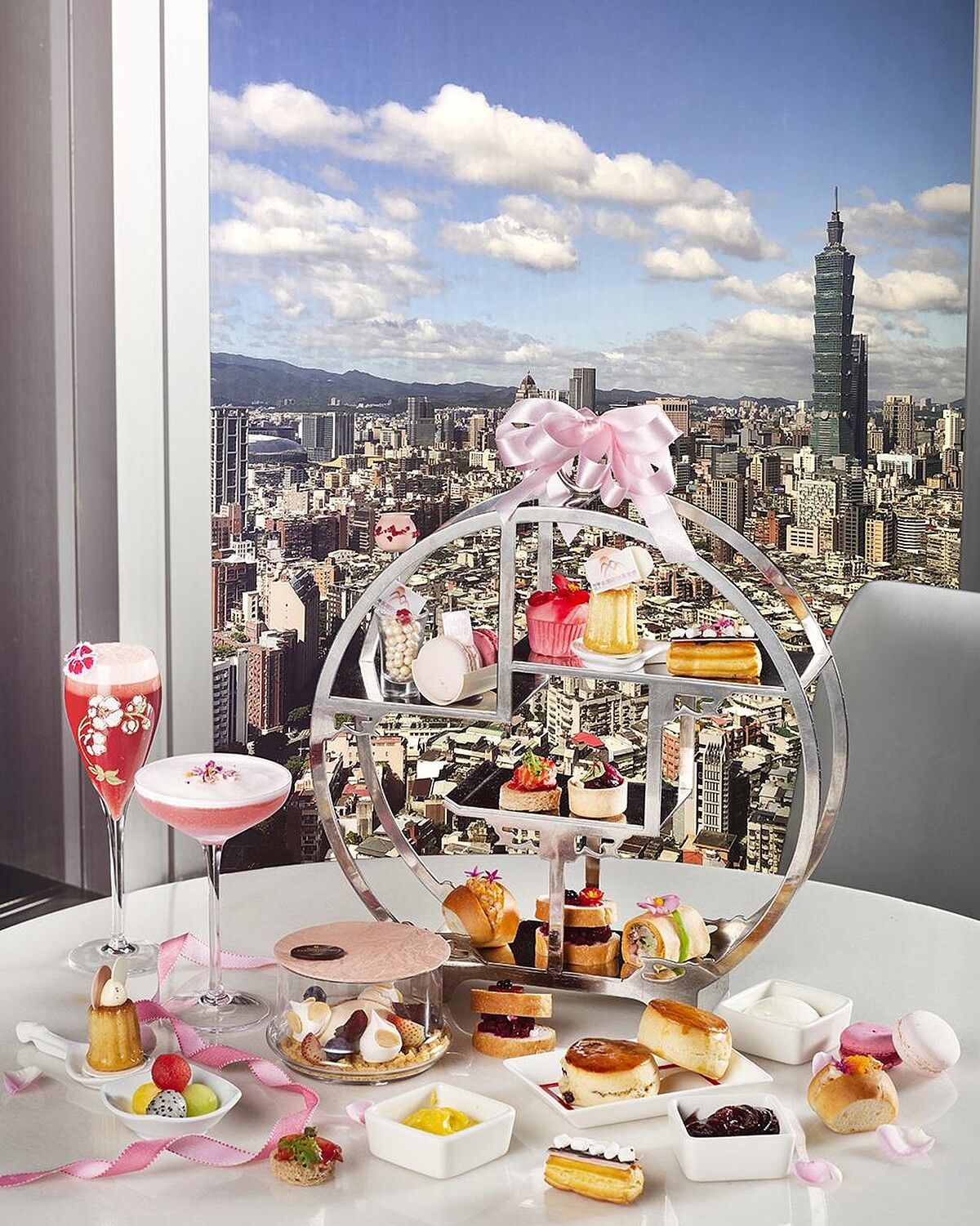 此次時尚公益下午茶組由香格里拉台北遠東國際大飯店法籍甜點主廚胡孟洋(Yann Roumanille)精心設計,以關懷女性身心健康為靈感發想,展現生命溫暖的力量,追求「圓滿」人生作為主題,主廚特意在多款鹹甜點的食材與造型上別出心裁,在顏色搭配上以粉色系擄獲少女心,搭配從38樓遠眺的絕美風景,絕對讓美食達人拍個不停,少女心噴發!