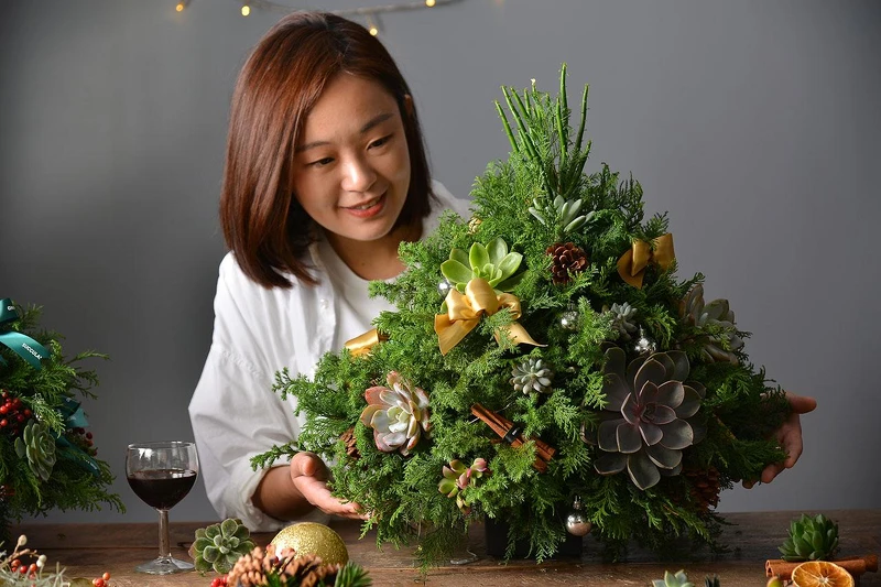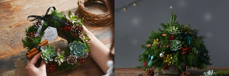 花形多肉植物搭配新鮮的松柏葉材,點綴濃郁香氛的乾果、肉桂,從無到有做出一棵聖誕樹或花圈,在充滿祝福與歡笑的 12 月,讓有肉專業的植栽設計師帶領你拋開日常的繁忙與緊湊,慢下心享受屬於多肉與植物的世界,帶你走入屬於植栽花藝的療癒空間。