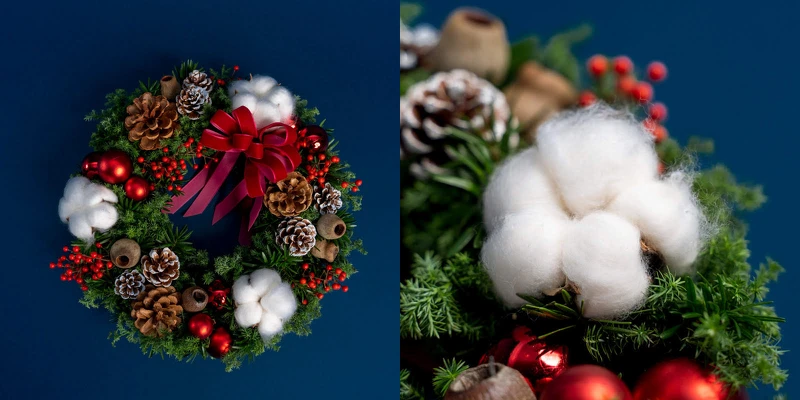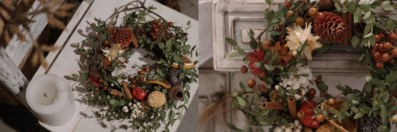 運用尤加利葉、松果、果乾、肉桂、繡球花等等素材編織而成手感花圈,維持方巷特有風格,溫暖整個聖誕節。可掛在門牆上或是平放桌面,再擺上燭台等裝飾品,營造滿滿聖誕氣氛。
