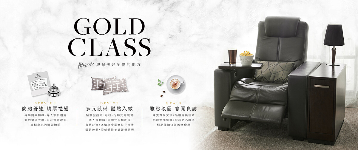 GOLD CLASS頂級影廳是您典藏美好記憶的地方!擁有輕鬆窩心的購票體驗,專屬購票櫃檯、專人領位禮遇,您可在簡約優雅的大廳自在歇憩,或與三五好友品嚐佳餚、來場食尚交流,影廳內更提供貼心毛毯、行動充電設備、個人置物櫃,以及隨時可輕鬆調整觀影角度的舒適座椅,滿足您深刻體驗放鬆看電影的娛樂時光;套票銷售影城:新竹大遠百、台中TIGER CITY、台南南紡、高雄大遠百威秀影城GOLD CLASS頂級影廳,活動詳情請洽影城服務專線或威秀影城官方網站http://www.vscinemas.com.tw/