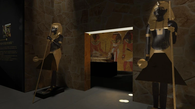 帶領民眾穿梭千年目睹古埃及帝國生活的「墓室文化區」,並設計光影互動牆,民眾得以在此觸發靈界的僕役-薩布提,活靈活現的展示世人想像的靈界生活。