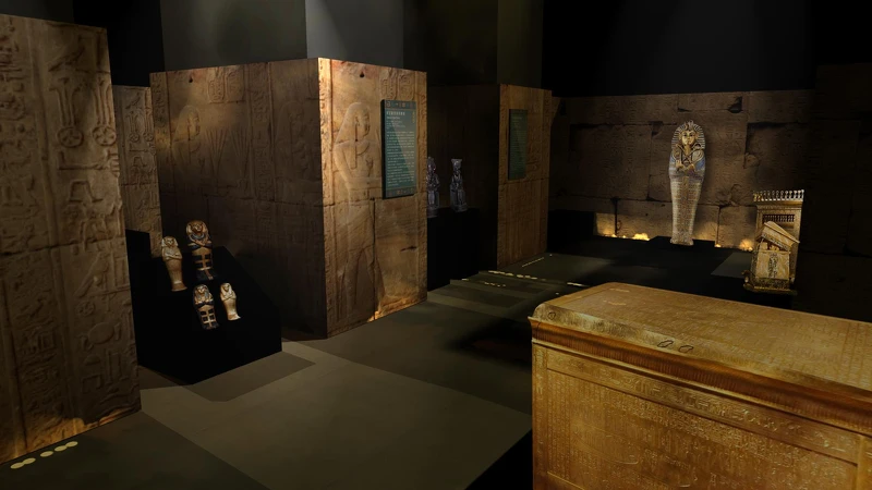 圖坦卡門主題展首次來台,一次展出共五百多件展品,並依主題規劃設計出五大特色展區,包含能夠體驗深入法老長眠千年古墓的「墓室還原區」,於此區更將近距離觀賞法老沉睡的鍍金黑木造人形棺、及從壁畫透析埃及皇室的生死信仰。