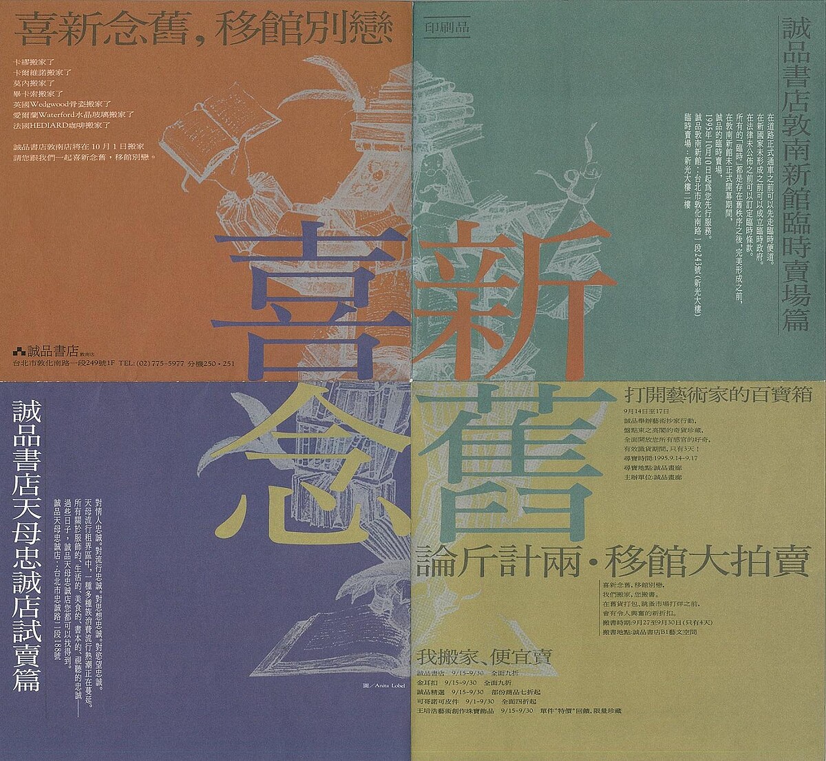 3/26-4/15誠品敦南店復刻經典的「誠品晒書節」,邀請舊友新知一起來挖寶!此次晒書節更精心策畫「翻箱倒櫃藝文事件簿」,展出歷年來誠品重要紀事文宣品,包括1995年與《聯合報》、《誠品閱讀》月刊共同舉辦「看不見的書店」徵文活動文宣,邀請讀者投稿分享對於書店的想像,這也是24小時書店的由來;還有1995年誠品敦南店自仁愛圓環搬遷到現址,舉辦「喜新念舊,移館別戀──今夜不打烊」活動文宣等,邀讀者一起走進誠品的時光長廊。五月底閉幕前豐富的典藏敦南倒數活動熱烈展開,邀請您把握時間一同典藏敦南!