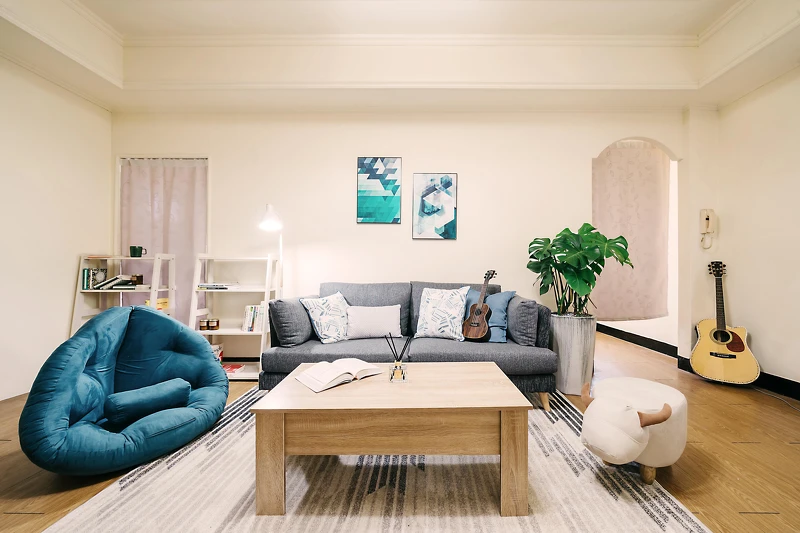 木頭椅腳、帶有文青氣質感的質感灰、外加有著舒適靠背與乘坐大面積設計的三人座沙發,搭配上白橡木色的收納功能茶几,隱藏過多桌面雜物之後,讓空間有著雅緻清新的氛圍,佐以北歐風格的幾何灰地毯,呼應整體色調,打造出沉穩閒適能讓人心情寧靜的客廳風格。