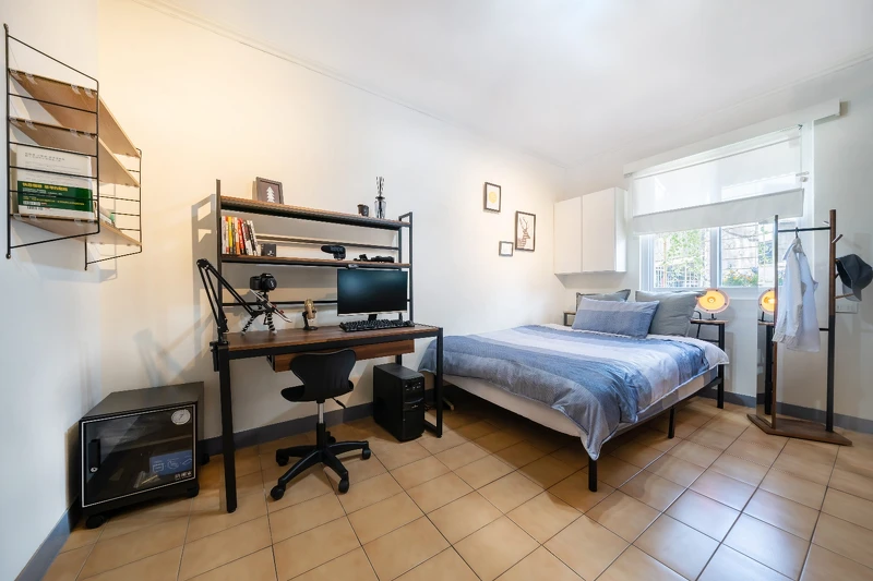 自己獨享的臥室小天地,重點就是將大型家具擺設固定之後,隨著床單、電腦桌、收納架上放置的個人喜好物品,房間風格自然就會跟著變動,清爽藍色頂級天絲床包在炎熱夏季是最能解暑減壓的選擇,木紋風全身鏡衣帽架與牆上三層多功能置物架,則減少了雜物在房中平面堆積佔空間的問題,即使是小坪數房間也能因此騰出收納空間,超適合熱愛在房間悠哉度過不被打擾休閒時光的族群。