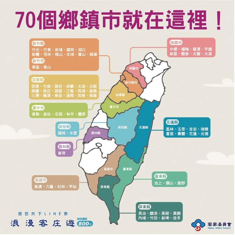 全國11縣市、70個貼有「浪漫客庄遊指定店」專用貼紙的客家文化重點發展區指定店,點網址查詢。