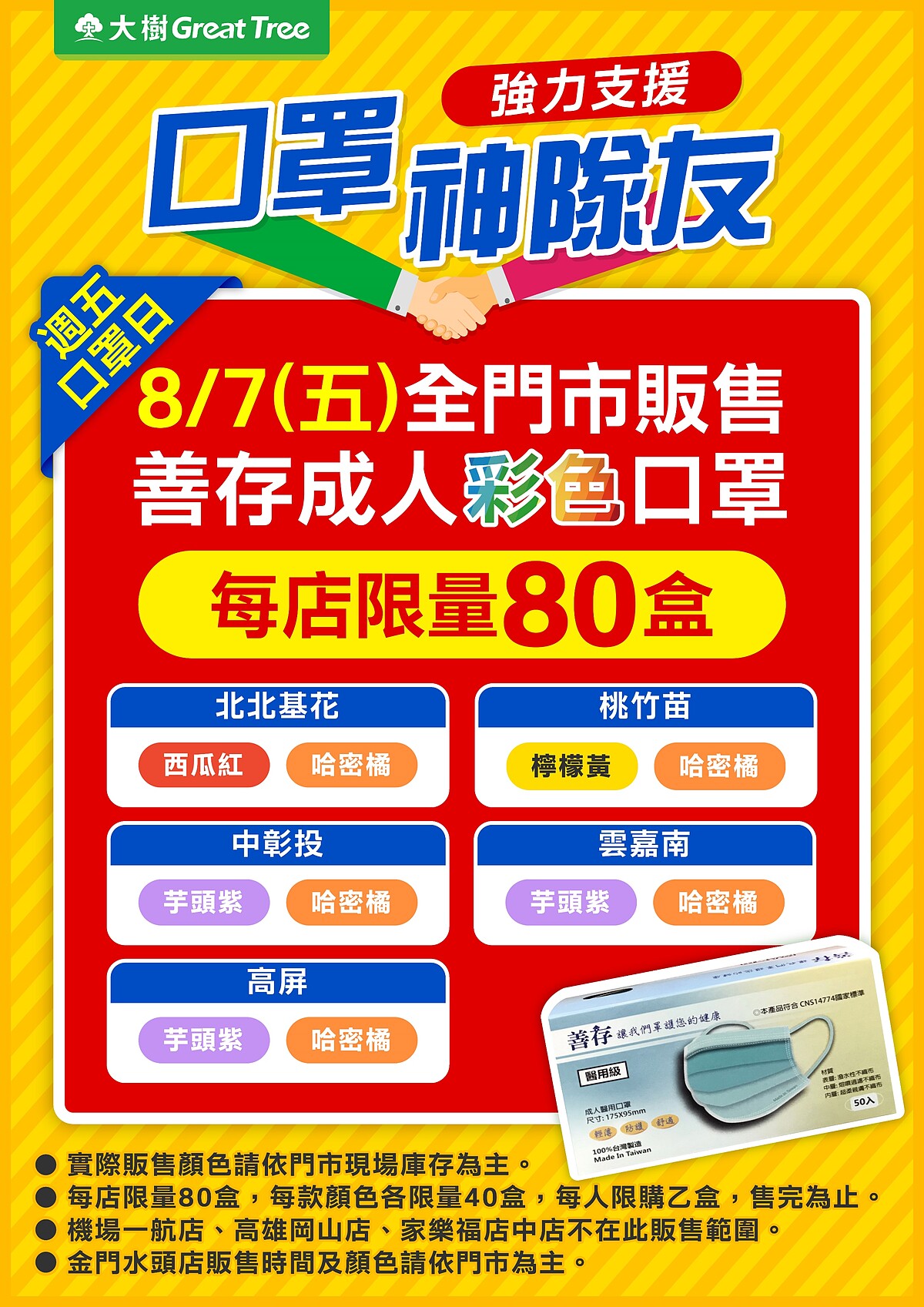 大樹藥局將於8/7開賣「善存成人彩色口罩」,採分色分區開賣,全門市均有80盒,每個顏色40盒,每盒50片裝,售價289元。