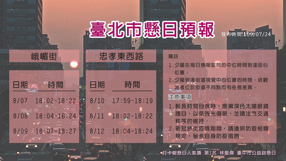 最佳觀賞時間為8/7~12連續6天的傍晚,時間約為晚上6點~6點半左右,最精華時間為10分鐘,中央氣象局公開更公開最佳拍攝地點為臺北市峨眉街(西寧南路以西)、忠孝東西路(新生高架以西)兩個路段。只要在無雲遮蔽的天氣許可下,都能親眼見證此美景。