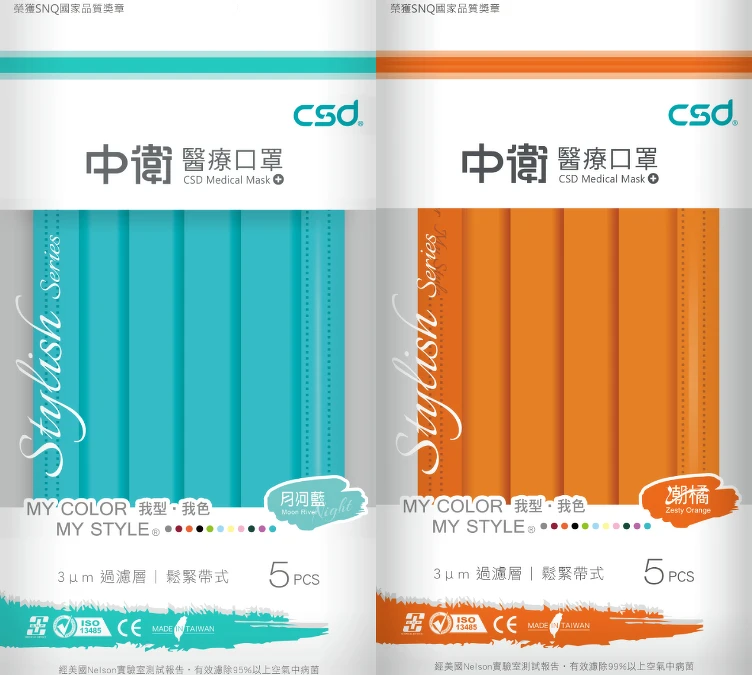 8/21:中衛醫療口罩-5片袋裝(潮橘/月河藍/黑+軍綠)