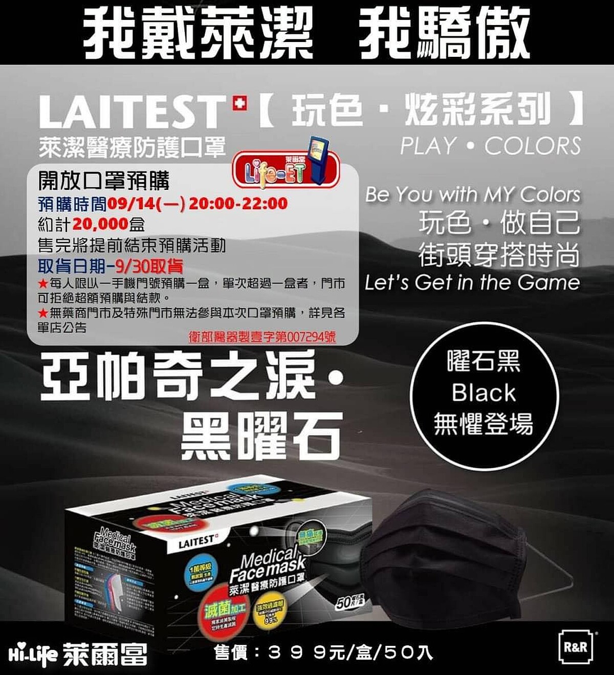 「軍墨綠」有搶到嗎?萊爾富最新宣布將於9/14(一) 20:00再加開新色系「曜石黑」醫療口罩預購,全台限量20,000盒,每盒50入,售價399元,1人限購1盒(不能代購)。