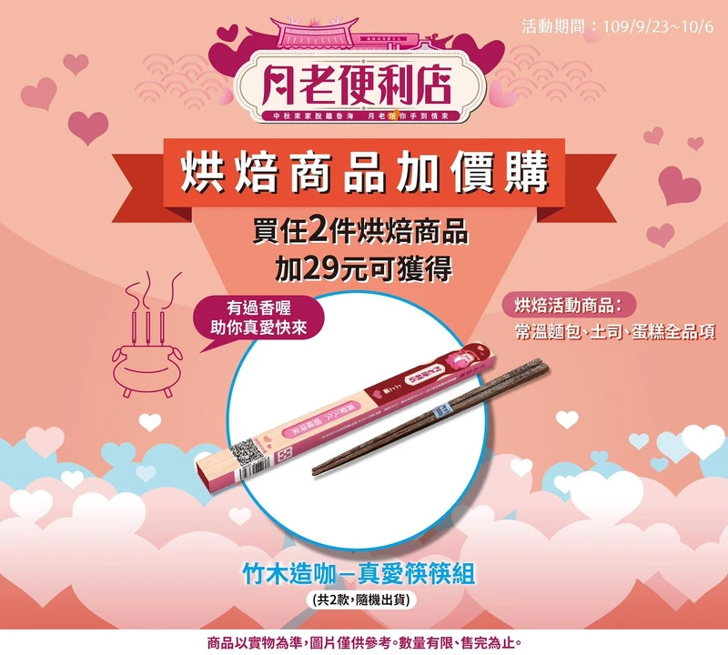 當然【月老便利店】不是喊假的!從現在開始只要你到全家便利商店購買烘培商品任2件,加29元還可以換購「竹木造咖 真愛筷筷組」,筷子共有「雞翅木筷」與「麻花竹筷」兩款,限量共6萬組(隨機出貨),每組都有霞海月老香爐滿滿仙氣加持和法師的開光祈福,剪下外包裝的月老爺爺上上籤還可以當書籤用,彷彿雙倍神力助你姻緣「筷筷籤成」,脫離母胎單身的魔咒!已經有另一半的人,也可以作為祈求平安的小法寶。