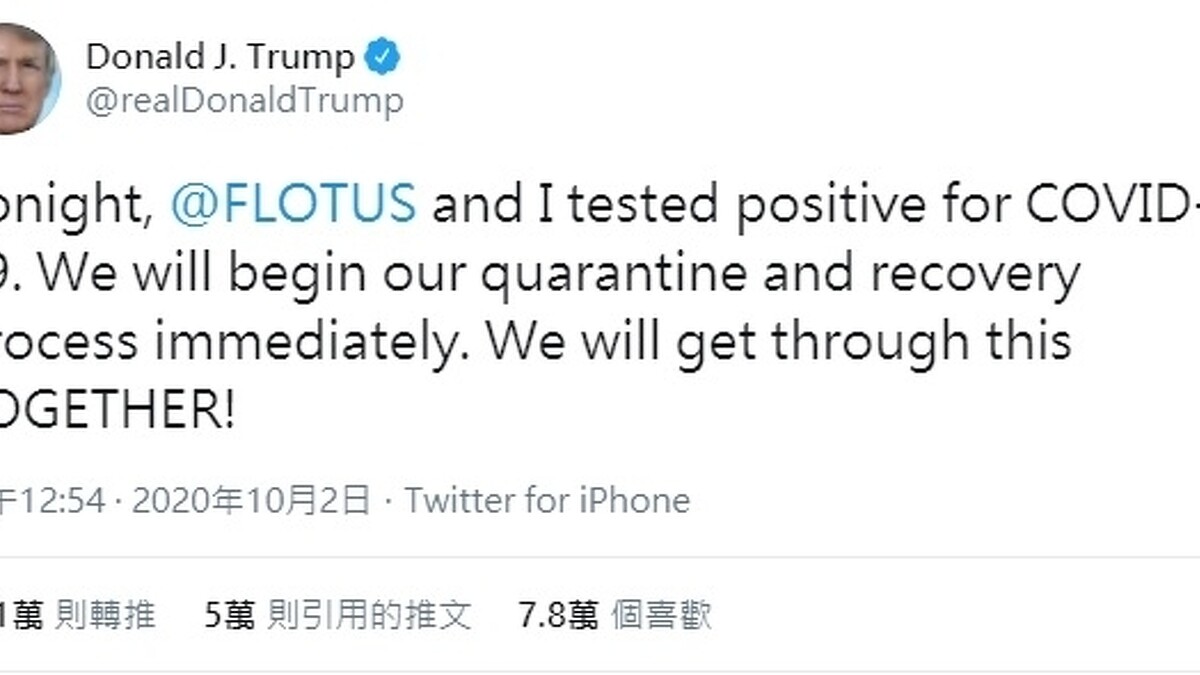 74歲的川普稍早自行在Twitter上宣佈確診消息,表示自己和第一夫人梅蘭妮亞檢驗的COVID-19結果為陽性,已經展開隔離和治療,並表示:「我們會一起撐過去。」。