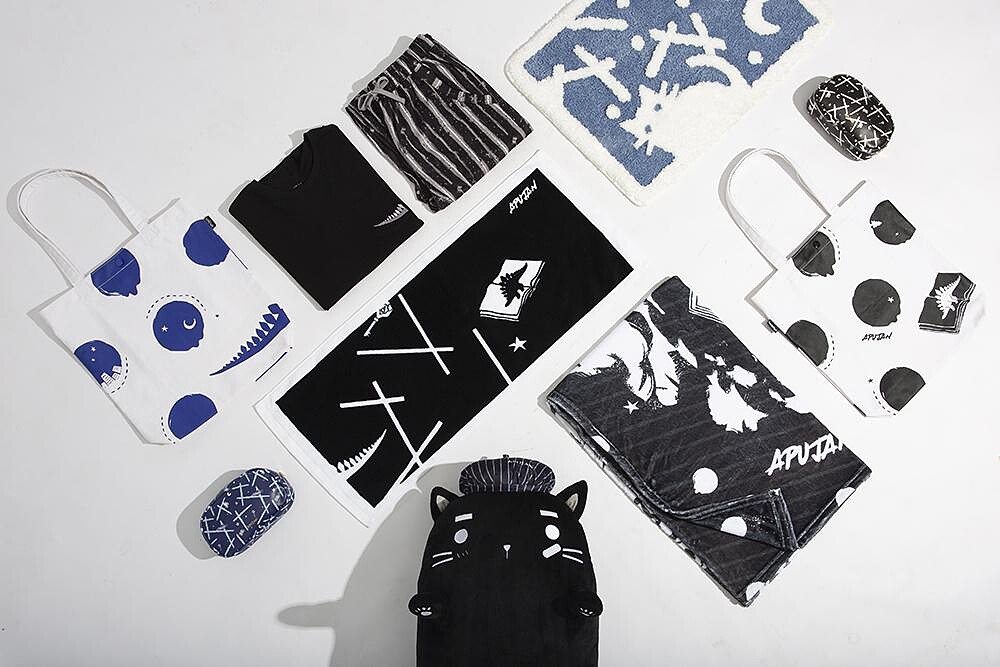 這些聯名商品的創作過程中,詹朴對於自己首次嘗試 娃娃製作,是一項比較大的挑戰,他表示:「想對一個故事有所共鳴,就必須要有角色作為引線帶領大家進入故事情境,所以我們提出了 MOON 娃娃的想法,希望藉由 MOON 出現在各品項的畫面中,串連起商品。其實 MOON 在APUJAN 過往作品中也出現過,但是像現在這樣實體1:1出現是第一次,我們自己看到他的實體化也感到非常開心。」另外,原有APUJAN元素:世界觀中常見的恐龍骨骸、鑰匙、玫瑰花元素,以黑、白、灰、藍色系,搭配服裝款式上出現的圓點、斜紋與直條,運用緹花、印花、刺繡等技法發展出帶有時裝色彩與全家便利商店特性的家居微型系列。