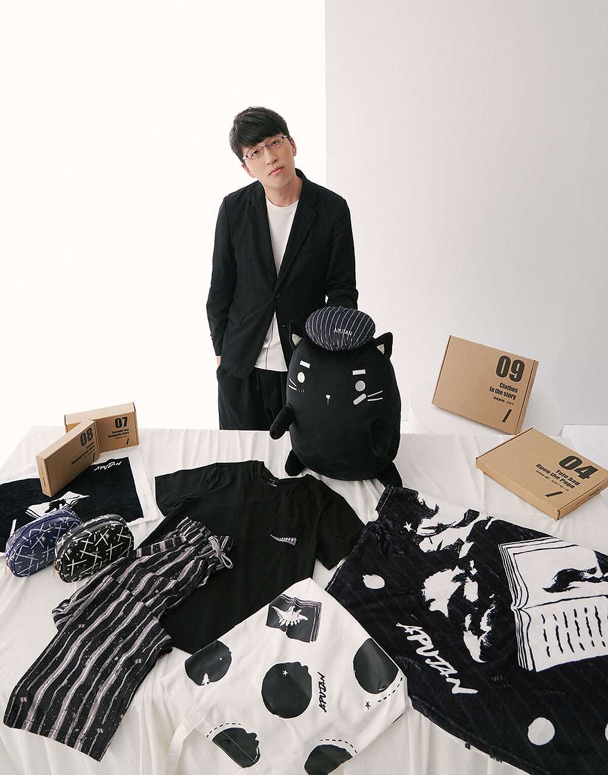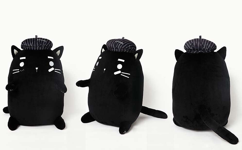 APUJAN 創意總監詹朴將個人手繪的角色—黑貓變身成超好摸的絨毛娃娃造型抱枕。戴著畫家帽的流浪貓MOON,貼著OK繃、自帶白色眉毛、腳掌處的刺繡肉球圖案,整個看起來可超萌超討喜,是陪伴日常生活的好伙伴。