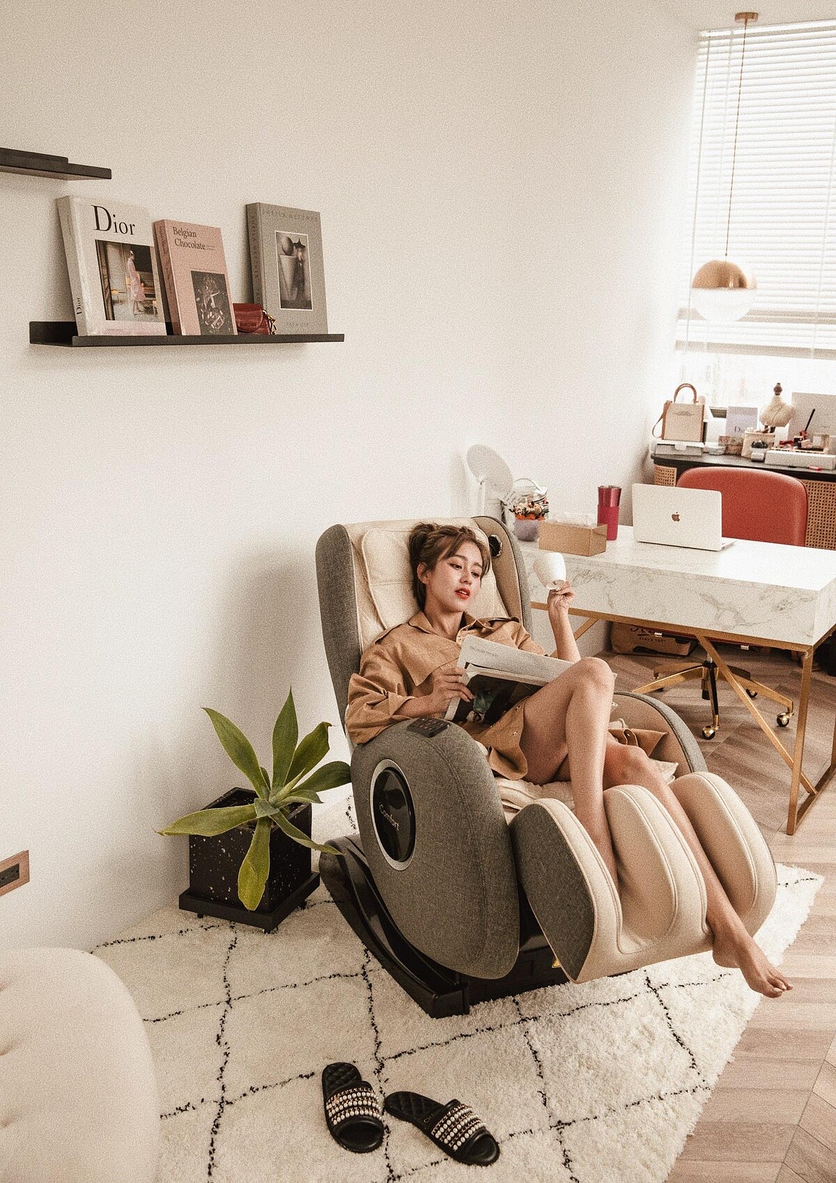 最近都在忙著新工作室打造大計的唐葳,整體的設計風格是參考安海瑟葳主演的電影《高年級實習生》中的辦公室,希望忙碌辦公的地方也能又美又舒適。因此,唐葳特別在自己辦公區佈置了個小角落,她希望在經過每天拍照、選片、寫文、想企劃…的整個行程結束之後,讓自己好好耍廢一下,但總覺得少了一個按摩椅,所以唐葳入手了TAKASIMA高島按摩椅的「愛舒服小沙發進化版」,讓她可以每天外景結束回辦公室第一件事就是躺上去好好放鬆,接著再繼續工作!