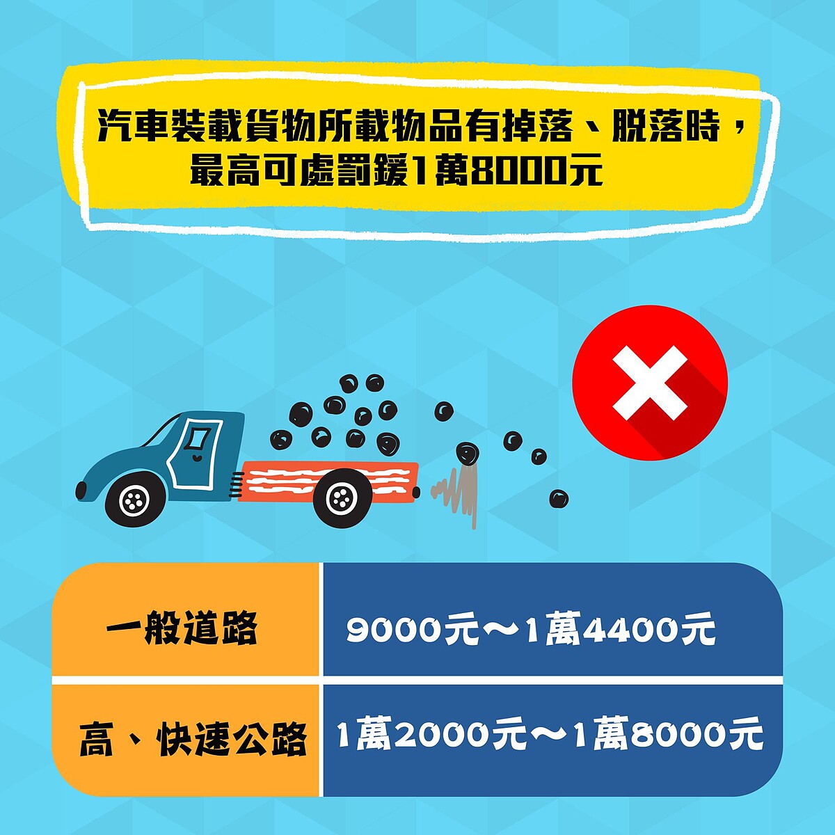 若所載貨物滲漏、飛散、脫落或掉落,一般道路可開罰4500~14400元;若在高速公路或快速道路上,最高可開罰18000元,是原有的罰鍰的兩倍。