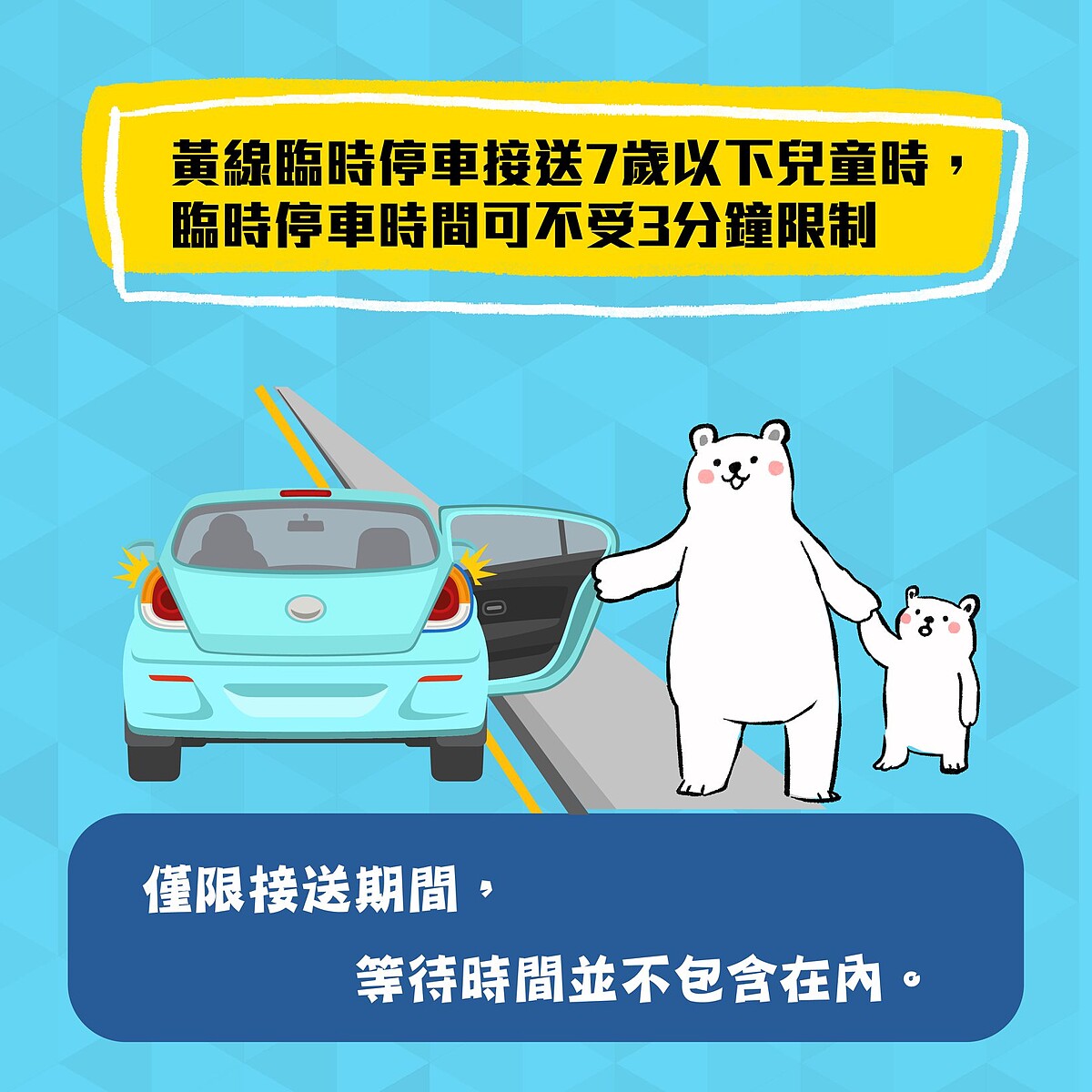 原定在黃線接送行動不便人士,能不限3分鐘時間限制,現在則放寬到未滿7歲孩童也同樣不受3分鐘限制,但不包括「等待時間」,僅以「接送時間」計算。另外紅線處依然規定禁止停車。