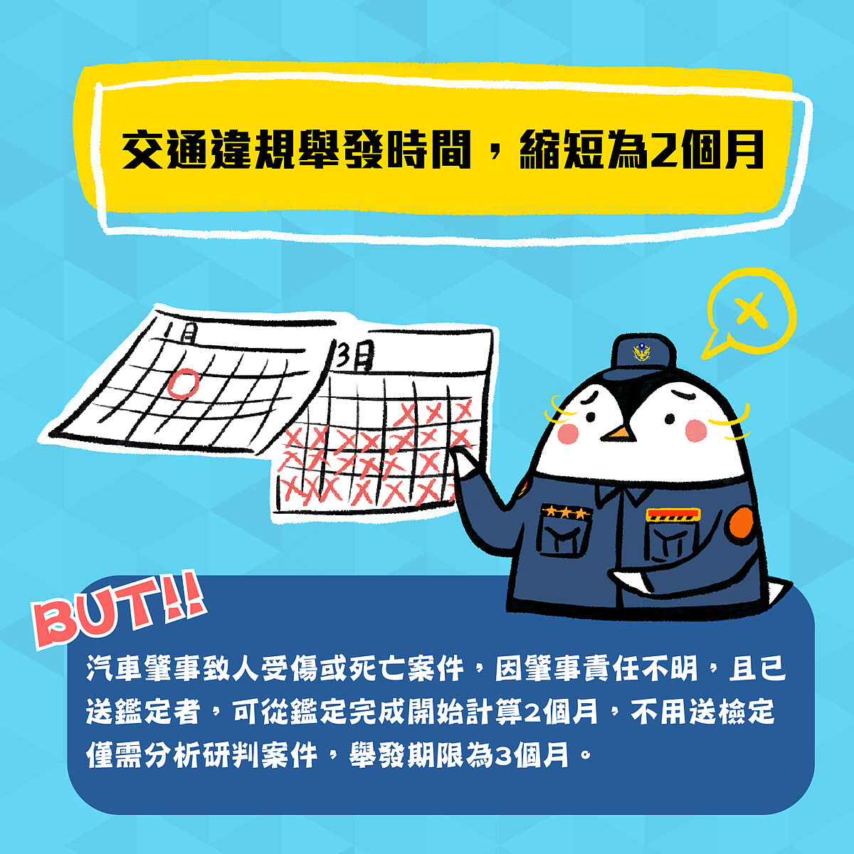 將一般交通違規案件的舉發期限,從原定的3個月縮短為2個月,汽車肇事致人受傷或死亡案件,未送鑑定而須分析研判者,最長不得超過3個月。這樣的改變是為了讓違規者能盡早收到舉發單、減少連續被開罰單的狀況。