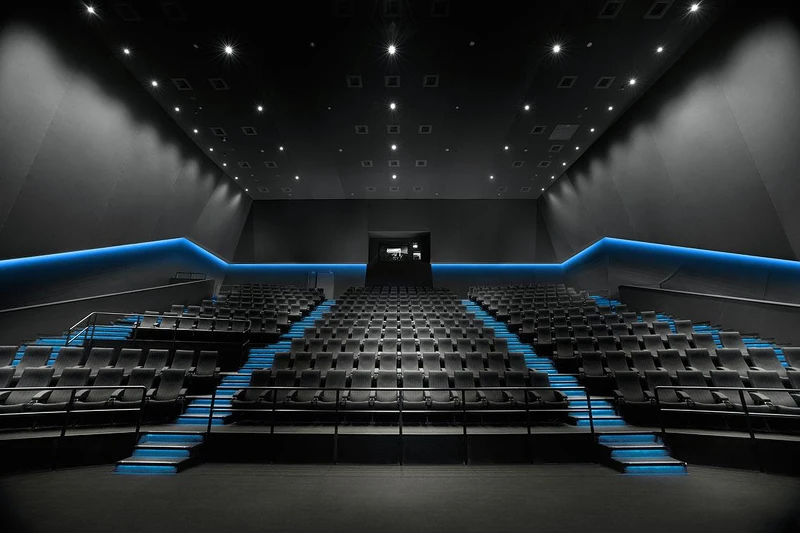 影廳環境有吸光的「蠶繭牆」,搭配兩側向下照射的引導燈光,選用最能讓人平靜的藍色,加上全黑不反光的訂製座椅,讓整體空間質感升級,也讓觀眾更舒適的享受電影時刻。