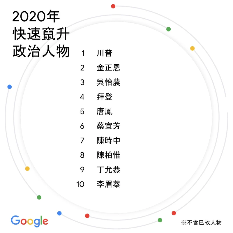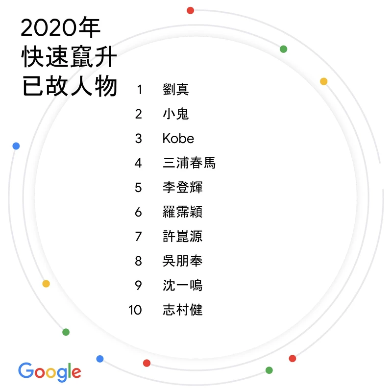 2020年無疑也是個令人感傷的一年,Google也特地整理出「快速竄升已故人物」,其中以劉真、小鬼黃鴻升、Kobe、三浦春馬等明星球員驟逝,都令人錯愕不已。還有「快速竄升政治人物」,成功擊敗顏清標之子顏寬恒的台灣基進立委陳柏惟,也引起網友熱搜搜尋起底。