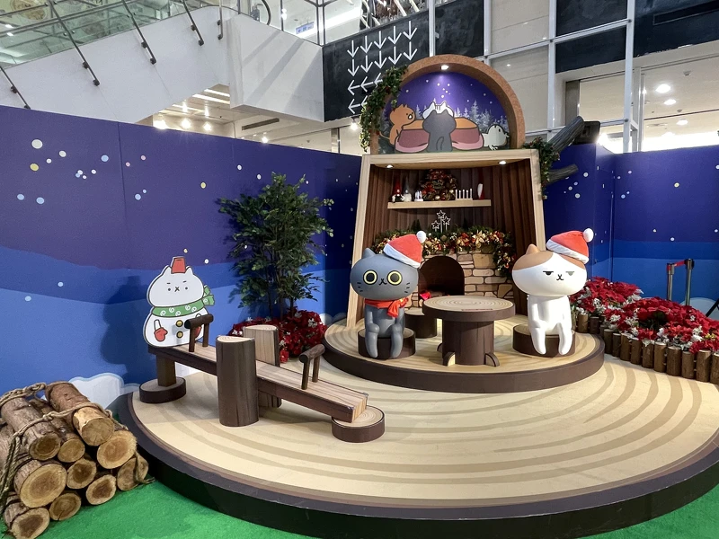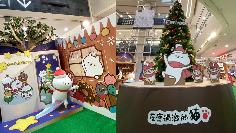 Global Mall新北中和全台獨家合作「反應過激的貓—森林耶誕貓村」,在二樓中庭設立了聖誕樹、貓咪交誼廳、聖誕星空場景、聖誕森林派對與貓屋快閃店…五大場景讓大家美照拍不完,而且還會定時從高空飄灑白雪,就像置身在貓咪森林中一起樣的夢幻好拍,加上貓屋快閃店的各種豐富周邊,歡樂開心的又拍又逛,讓彤彤忍不住大力推薦!