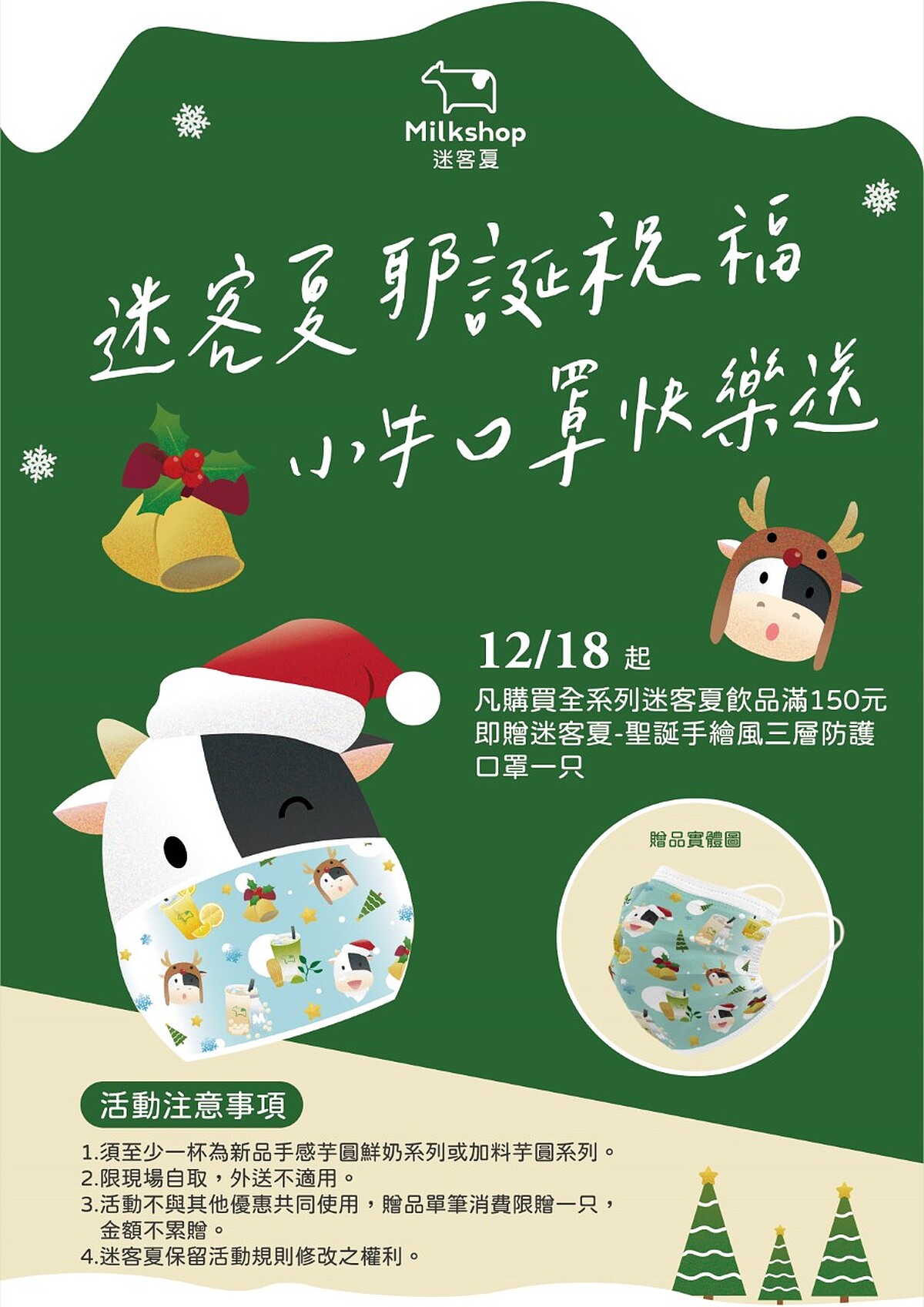 此外,趁著耶誕感恩季,《迷客夏》特別推出聖誕手繪風三層防護口罩,只要於12/18(五) 起到門市,單筆購買迷客夏飲品滿額$150元以上 (須至少乙杯含手感芋圓鮮奶系列新品或加芋圓配料)即可獲得,全台口罩限量70,000片,送完為止。