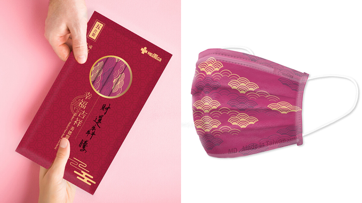 此外,這款新春口罩還運用象徵「大紅大紫」的富貴桃紅色,喜氣的桃紅底色和霧金線條,傳遞出吉祥平安的美好祝福,更設計出仿紅包信封式包裝,提供另類「紅包」送禮選擇。