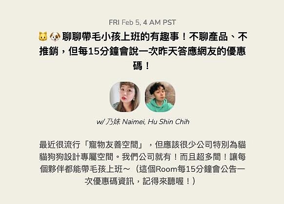 有發現一些房間開的主題可能是聊聊毛小孩(寵物)的飼養經驗,在聊天的過程也會穿插一些商品優惠資訊或者是折扣碼,也有一些是工作經驗分享,例如房間主題是行銷的經驗分享,談話之間也會透漏出主講人跟其他談話者的公司以及徵才資訊,甚至是直接線上對談面試。不管是想讓商品優惠資訊被更多人知道或是公司能快速找到適合的人才,都是目前Clubhouse衍伸出來的一些應用模式。