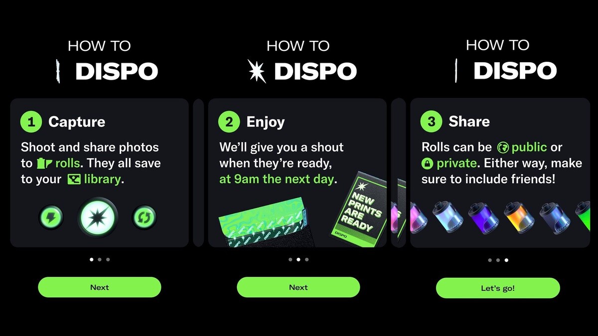 在Instagram上我們拍照可以套濾鏡,可以編輯後再上傳,但Dispo除了必須等到隔天才能看到照片外,當下也無法編輯或美化,回歸到底片的原始美感,也成了它最大的吸引力之一,用戶也能互相追蹤,選擇公開或私密瀏覽自己的相簿。