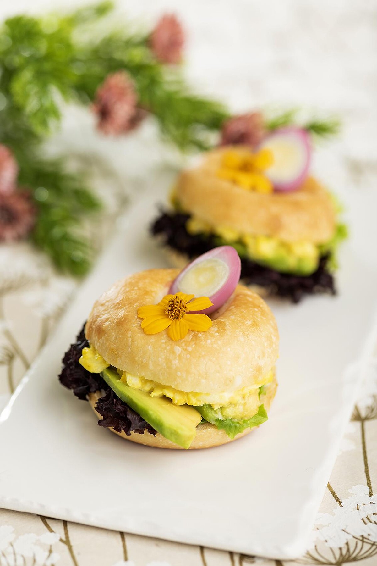 像是被照了縮小燈一般的迷你貝果小巧可愛,夾心也是豐富營養,以擁有「森林奶油」之稱的酪梨為主體,再加切碎的水煮蛋,主廚也在貝果之上放上一片粉色水煮蛋切片,讓整體外觀更有型。
