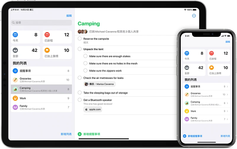 在家工作,或多或少也是一項專注力的挑戰。「提醒事項」app 助你建立包含子任務和附件的提醒事項,並根據時間和地點設定提示,為每項工作設下時限,有助提升效率,你亦可與同事或家人共享一份「提醒事項」列表,當對方接受邀請後,便可加入、刪除和標示已完成的項目。無論是工作任務抑或購物清單,不同範疇的待辦事項都一目了然。>>點此看更多
