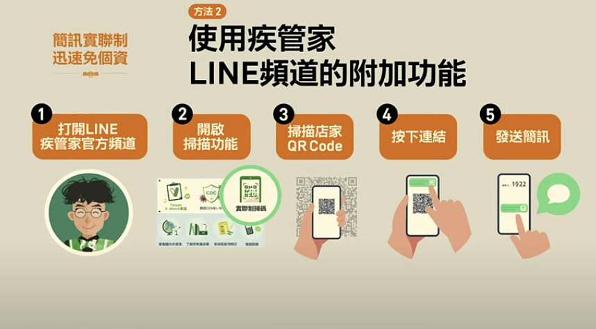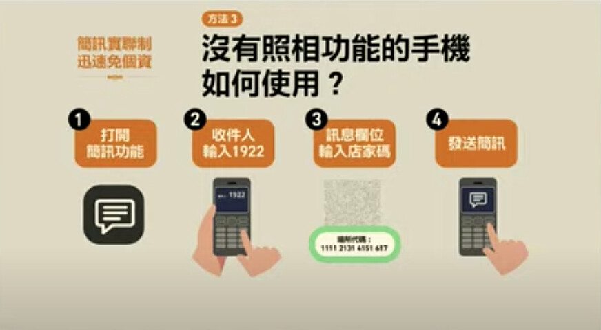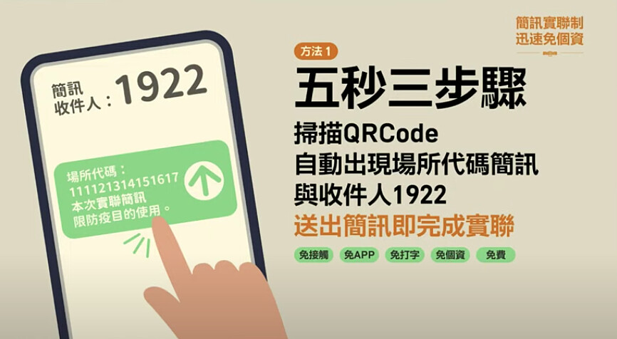 由唐鳳開發的「簡訊實聯制」,使用方法很簡單,未來只要掃描店家QR Code後,按下連結傳送簡訊給1922即可,不需要填寫資訊,如果若手機沒有照相功能,則打開簡訊功能,輸入1922訊息欄輸入店家碼、發送簡訊。