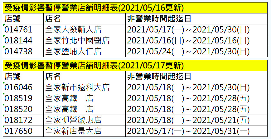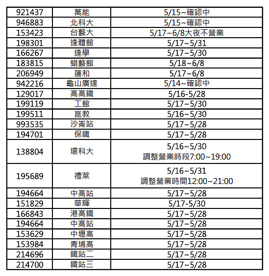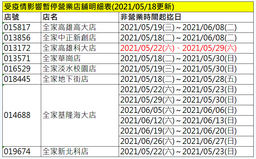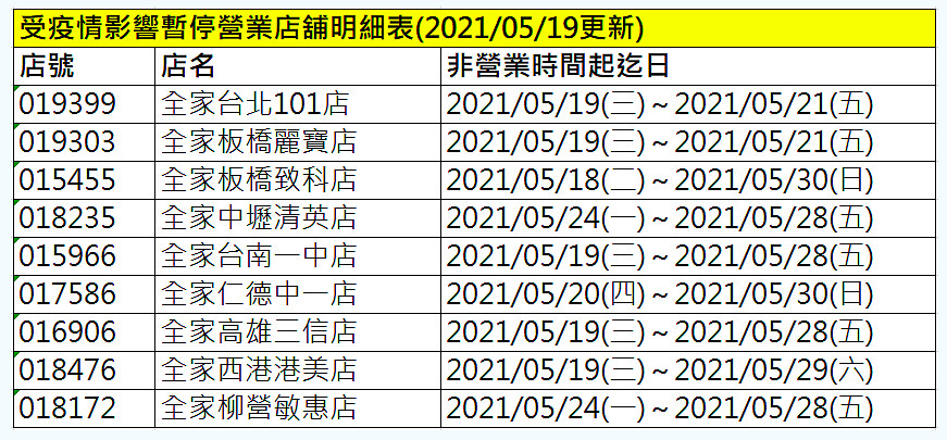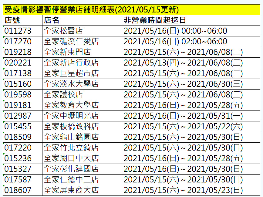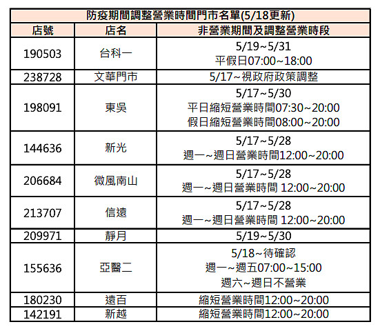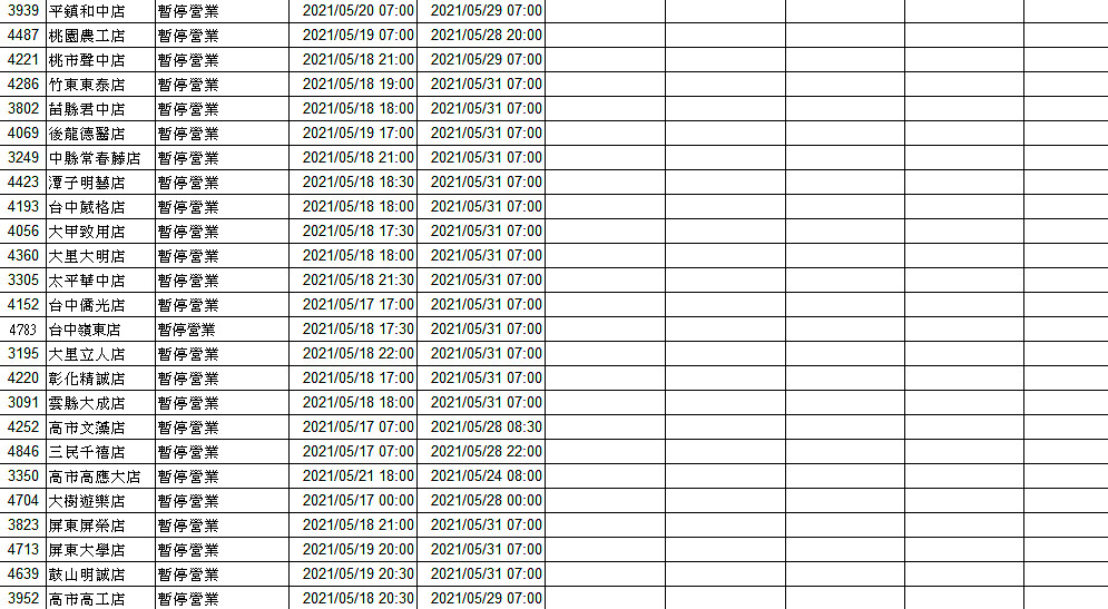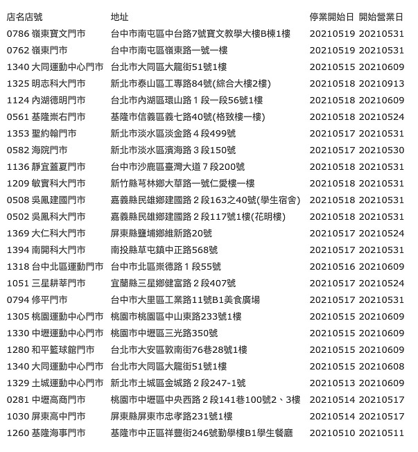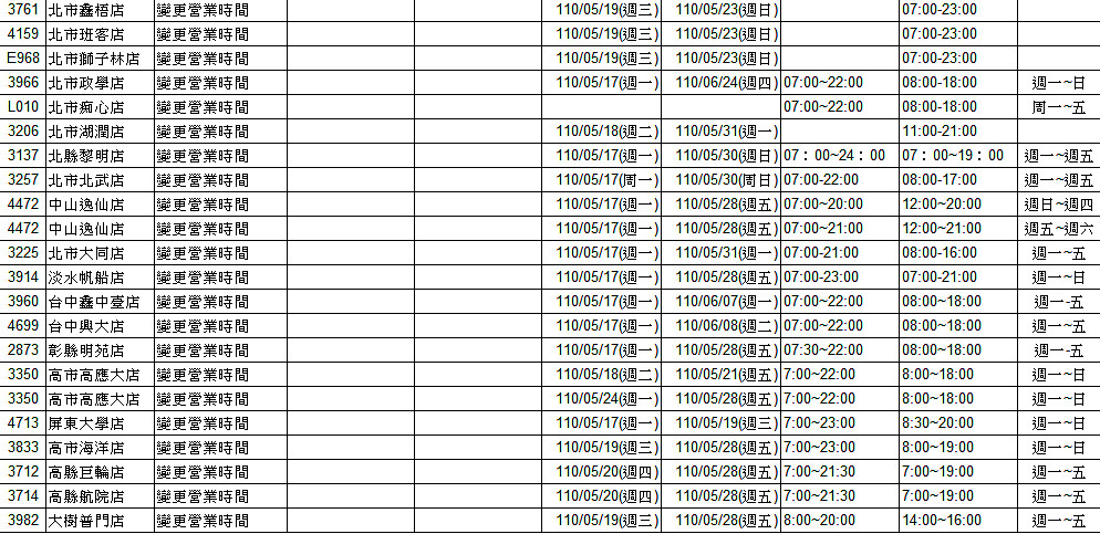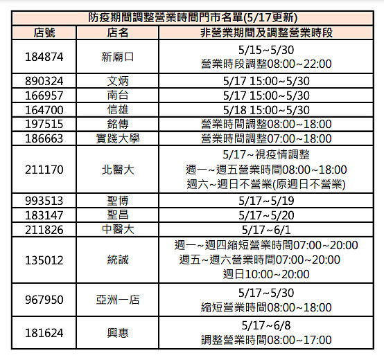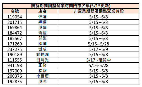 本土病例持續增加,中央流行疫情指揮中心宣布全台灣升級至三級警戒,而為了配合中央及地方疫情管控,四大超商皆紛紛調整部分門市營業時間,包含取消24小時營業、暫停營業。以下列出全台異動門市名單,必要前往時也請勤洗手、戴口罩、保持社交距離。