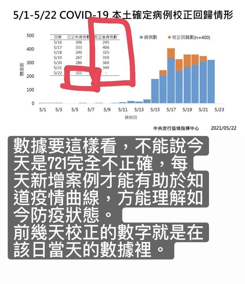 什麼是校正回歸?想必是大家正在討論的話題,疫情指揮中心宣布5/22確診數新增本土321例,以及400例校正後病例數,究竟數據該怎麼看,粉專「Dr. E 小兒急診室日誌」、炎亞綸也在IG發表看法。