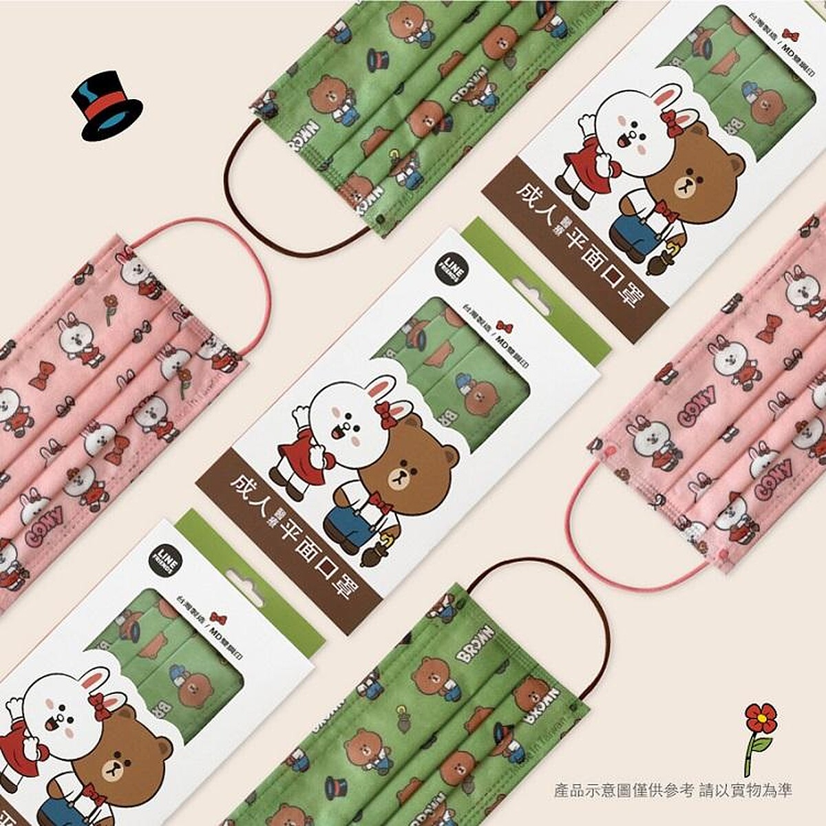 台歐企業全新推出LINE FRIENDS與三麗鷗設計款口罩,其中LINE FRIENDS款可以看到熊大換上白襯衫吊帶褲,戴上俏皮高帽子,瞬間化身復古紳士,兔兔則換上復古風十足的紅色連身裙,還一起戴上情侶款的紅色蝴蝶結。