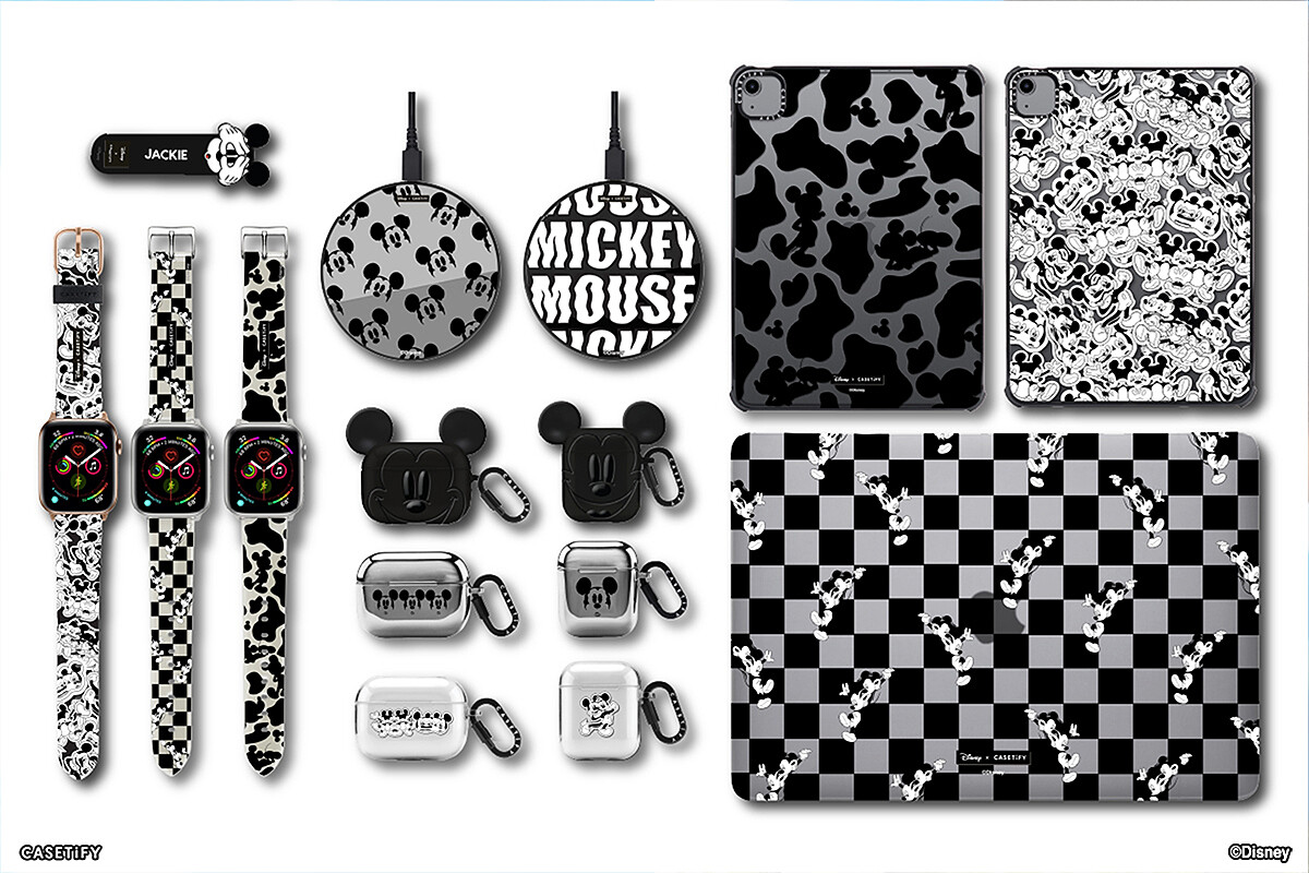 此次聯名品項同樣多元,經典防摔手機殼、夜光流沙手機殼及質感黑色鏡面手機殼都能找得到,也包含客製化款式。還有Apple Watch 錶帶、二合一手機支架、iPad保護殼、無線充電盤及MacBook保護殼,也都換上黑白米奇風格,各處都能被這位人氣角色佔據。