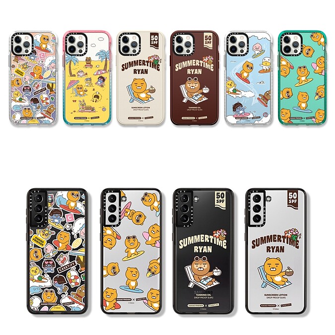 多款手機殼皆採用專利防震材料,上面有人氣主角萊恩Ryan慵懶躺在沙灘椅上的愜意畫面,還有它一派輕鬆地衝浪,是不是很懷念到海邊戲水的日子?另外還有Apeach桃子、狗貓情侶檔Frodo&Neo、鴨子Tube、兔子外型的Muzi、鱷魚Con等,一起出遊的畫面實在太可愛!