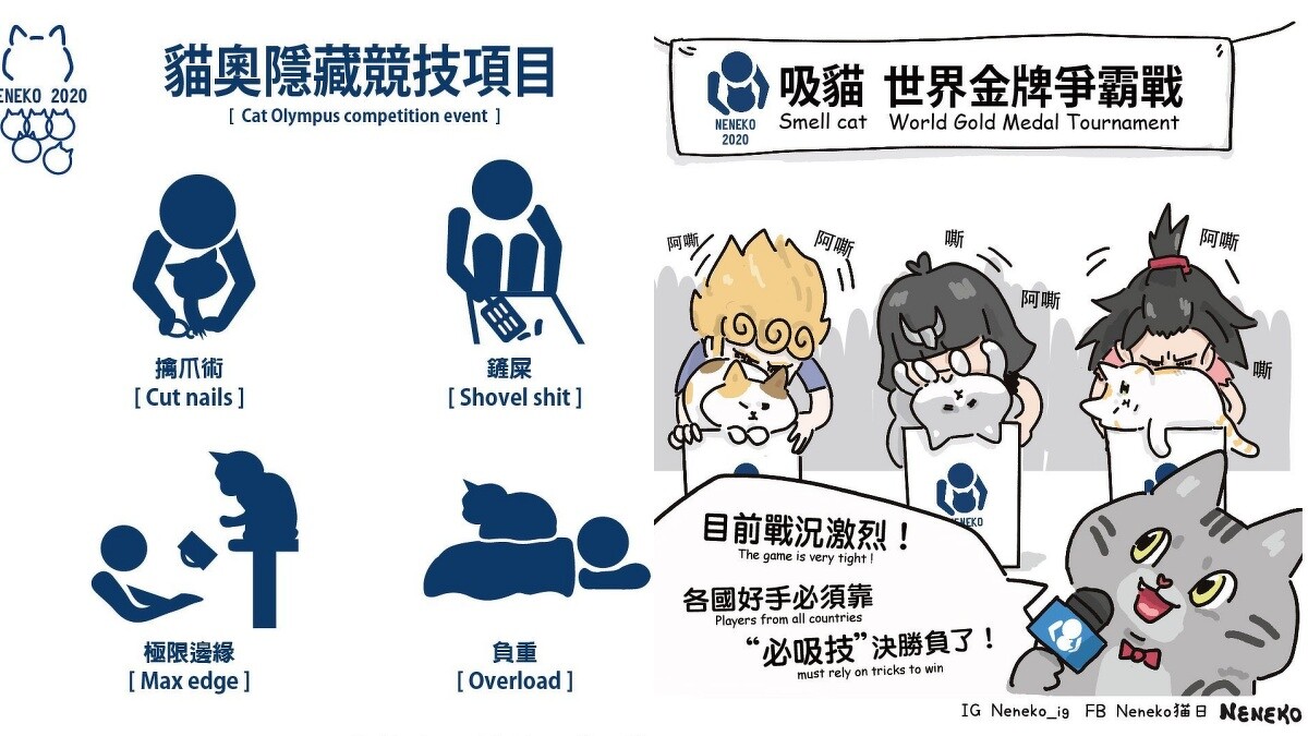 2021東京奧運賽事競爭激烈,台灣健兒們在東奧場上打出一場場精彩絕倫的賽事!而台灣人氣插畫家neneko貓日發揮創意以人與貓咪的對決畫出了2020貓奧公開賽、吸貓世界金牌爭奪戰,其實各國的貓奴們每天都與貓咪比了不下10次的精彩賽事,相信不少人都能拿下數面金牌,大家最想參加的是哪一項呢?