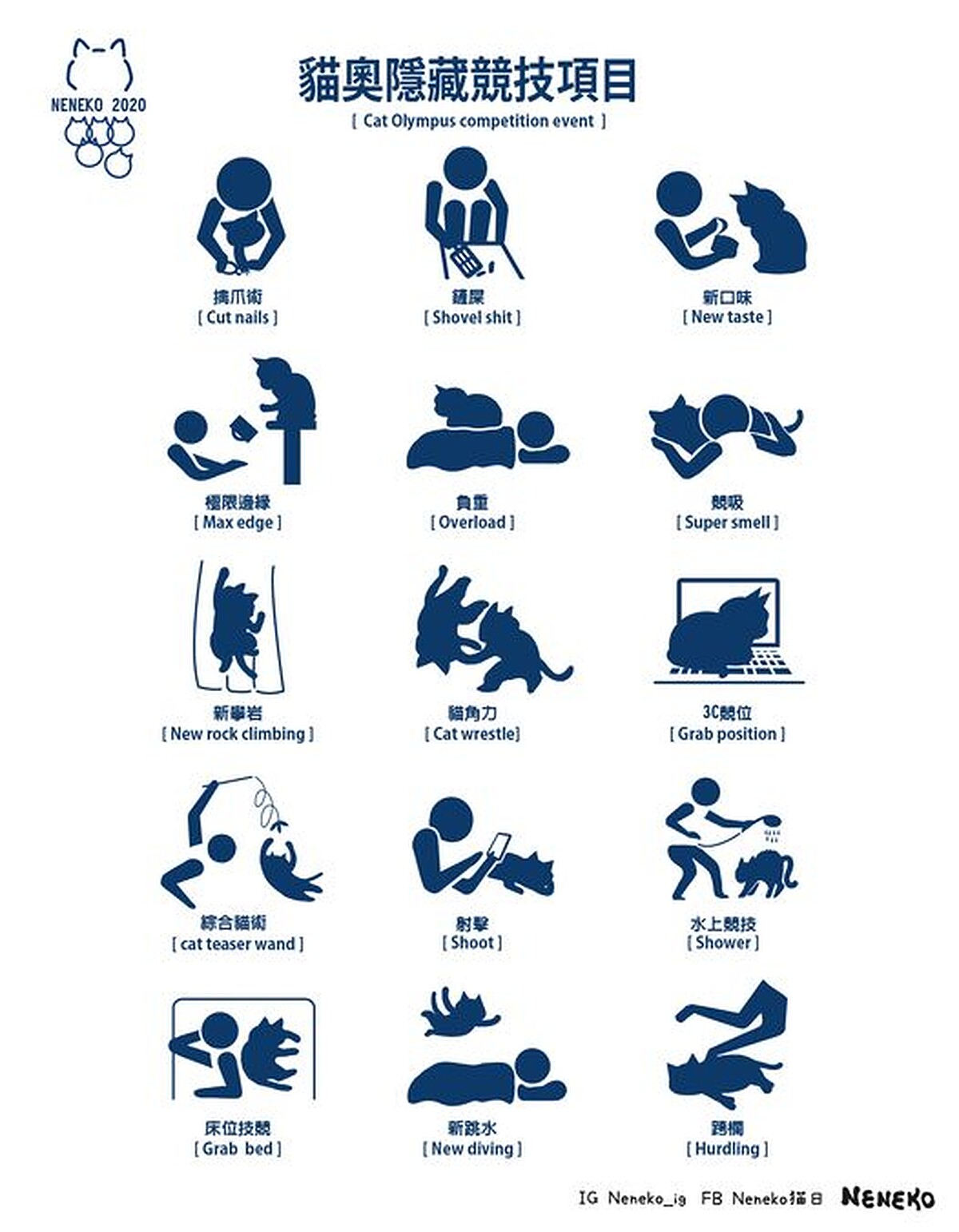2020貓咪奧運比賽項目從最低難度的鏟屎、競吸、新口味、射擊(拍照),更進階的項目則是貓角力、新跳水、綜合體術等等,共有15種超有創意的項目!相信台灣的貓奴們選手們有望在鏟屎、競吸、拍照射擊奪下金牌!