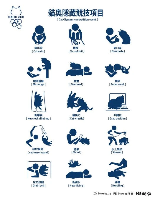 台灣人氣插畫家neneko貓日發揮創意畫出2020貓奧公開賽、吸貓世界金牌爭奪戰,人類與貓咪將展開激烈對決,比賽項目有競吸、極限邊緣、鏟屎、3C競位…等,貓奴們最想參加哪一項?