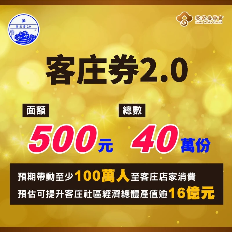 將發放40萬份數位客庄劵,每份面額500元。比去年多12萬份,預期帶動100萬人至客庄店消費、提升總體產值逾16億元。