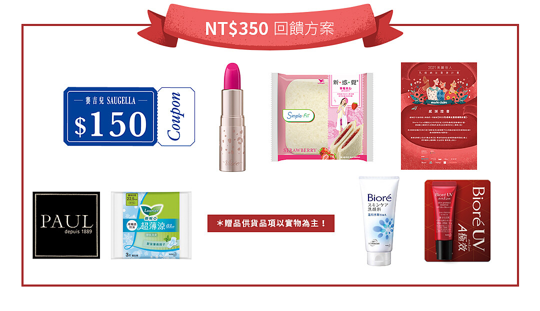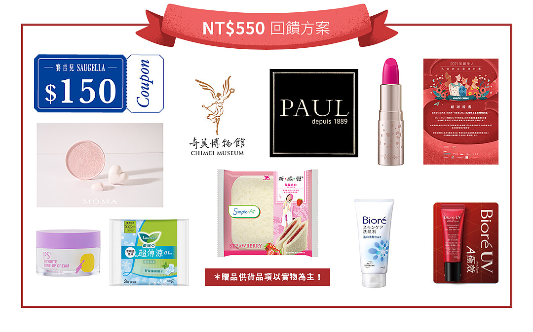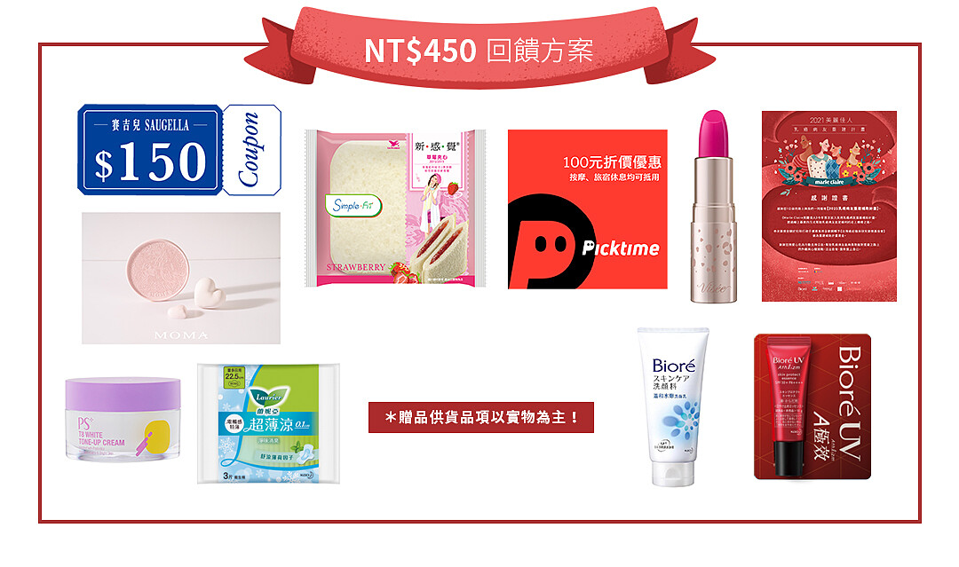 電子版感謝證書乙份、賽吉兒 官網折價券150元乙張、Visée 渲光小唇膏乙支、統一新感覺 夾心土司乙份、Biore'UV A極致 SPF50+ 10g 乙份、蕾妮亞 零觸感特薄衛生棉三入組 乙份、Biore'溫和水嫩洗面乳 15g乙份、PICKTIME 折價券100元 乙張、MOMA 愛心擴香石 乙份、東森自然美 PS+美美妍 素妍修修光圈霜 50ml 乙罐
