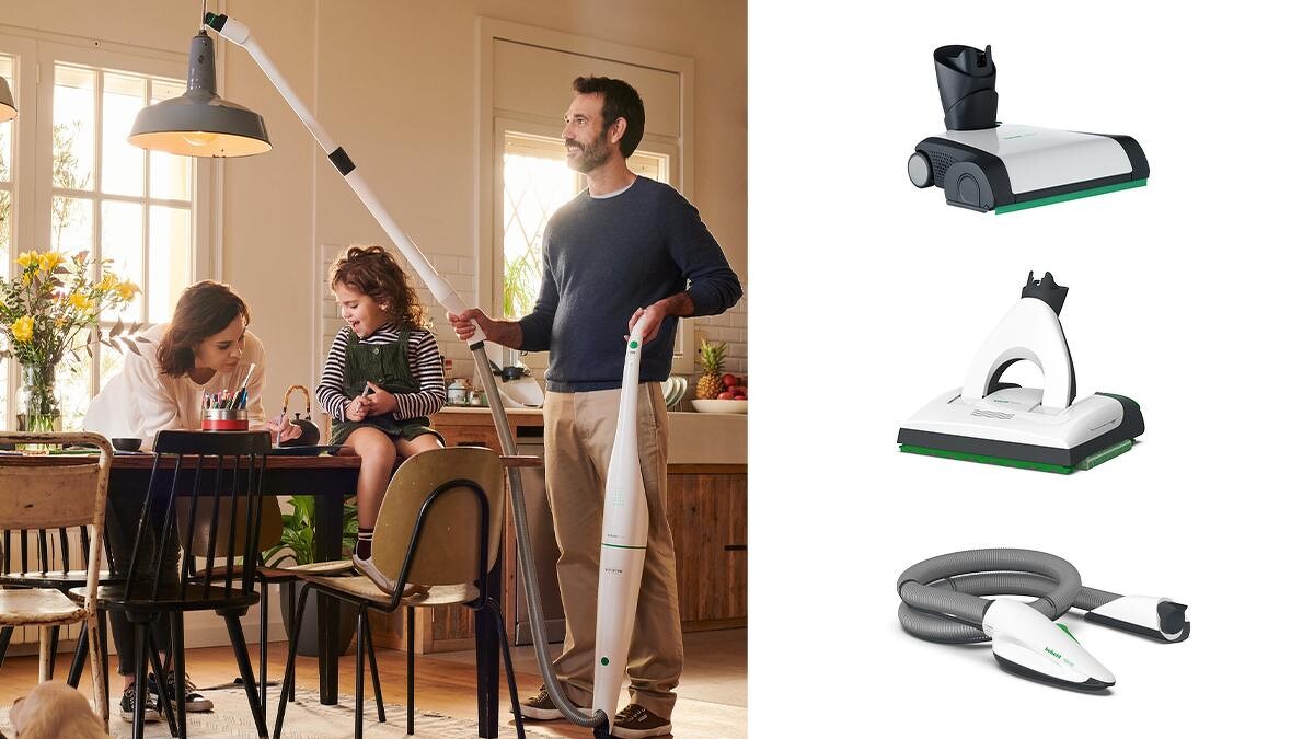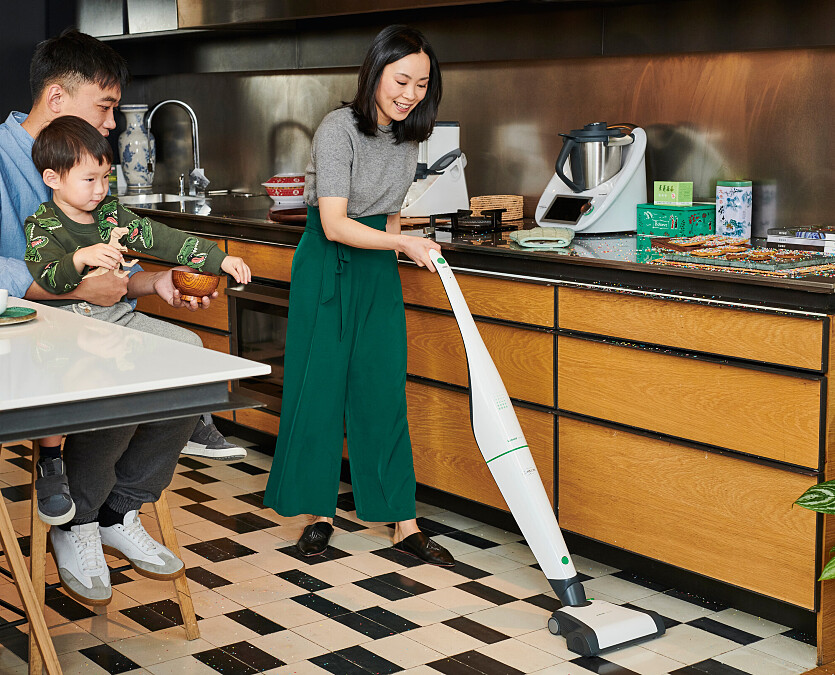 多種吸頭組合是「VB100無線清潔系統」的最強特色—能在軟、硬地板及地毯上廣泛運用的「深層電動清潔吸頭」,利用直流電動馬達的高強度吸力,細小的灰塵髒污都能連根拔起,基礎吸地完就如拖過地一般乾淨;如果要除窗簾、寢具、沙發等布質面料上的灰塵,建議改換「沙發布質家具吸頭」搭配使用,可一鍵切換不同吸口,更能貼合面料清潔,專剋毛髮、塵蟎過敏、皮屑,平面或隙縫通通吸得乾淨。要達到完美清潔不只除塵還要乾擦濕拖才算安心,換上「二合一乾濕拖吸頭」就能完成邊吸邊拖的懶人夢想,吸塵濕拖同步進行,以擬人手畫圈動作,每分鐘1350轉的震動頻率,極速擦拭強力去污,拖過還不留水漬,以往要先吸地再拖地,現在只需一半的時間就能輕鬆完成。