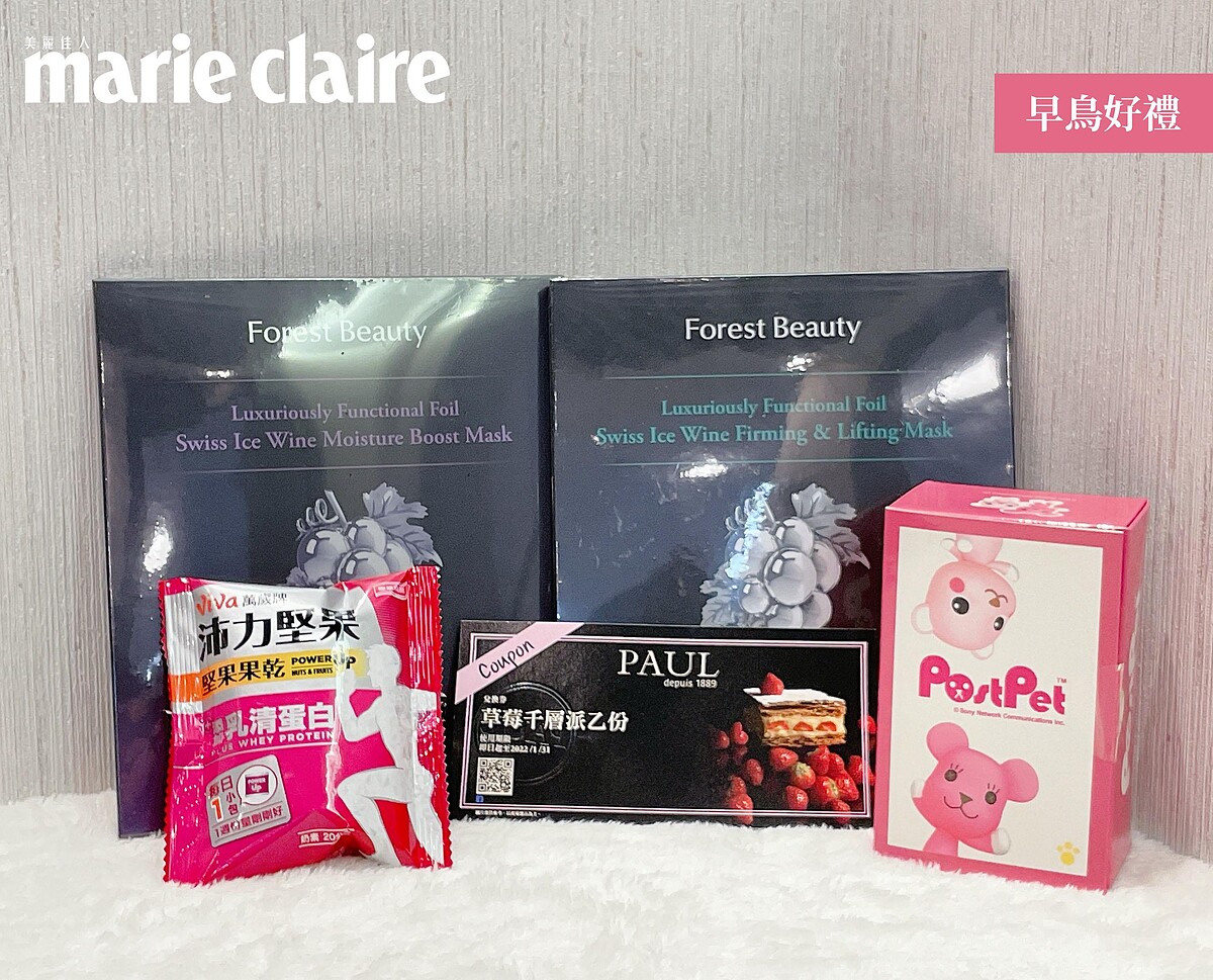 草莓千層派一份兌換券 乙張、瑞士冰酒緊緻修護面膜 乙盒、瑞士冰酒潤澤保濕面膜 乙盒、沛力堅果果乾20G 乙包、MOMO熊公仔 乙隻