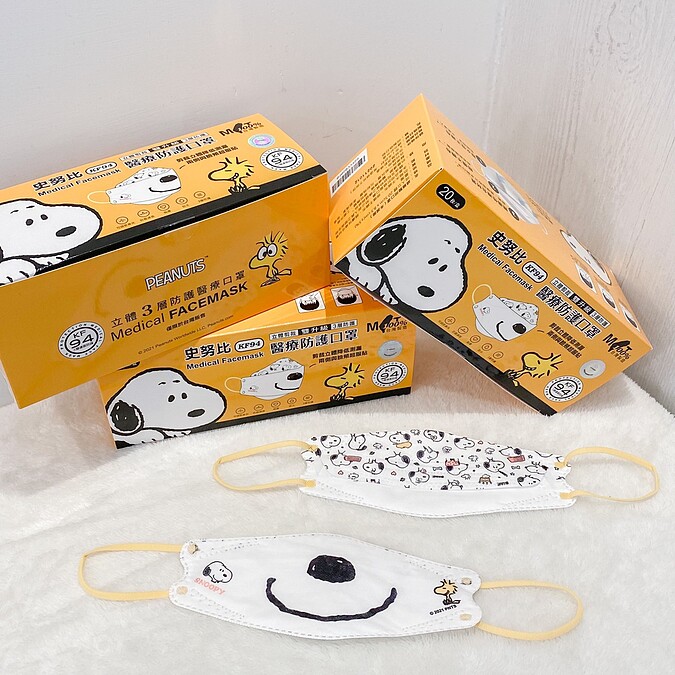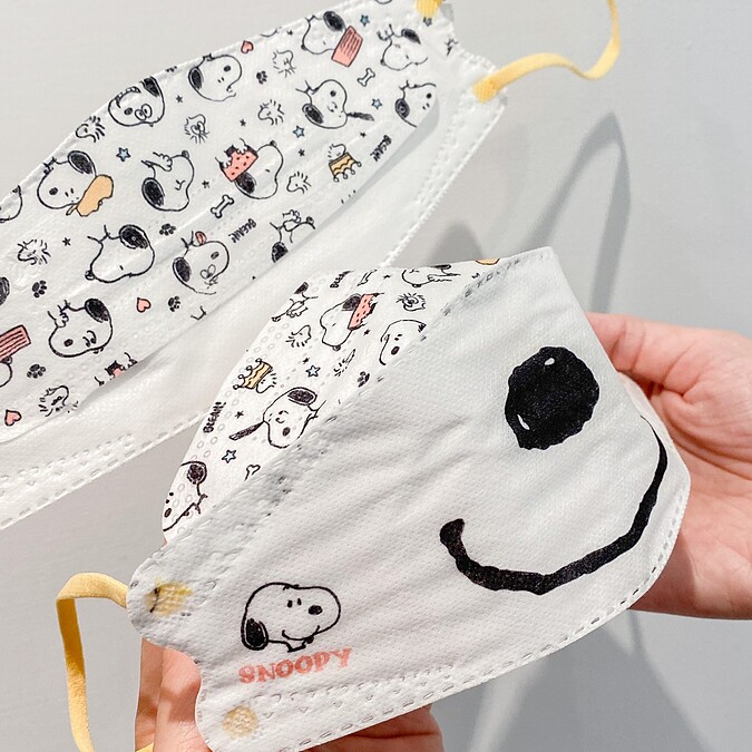 口罩正面就是SNOOPY的笑臉,上方則是滿版的圖案,整體設計非常特別,採用防潑水性不織布,阻隔飛沫及水氣侵入,以及熔噴不織布能夠有效阻隔細菌,親膚材質戴起來舒適度滿分,讓史努比控們防疫之餘也能夠很可愛!