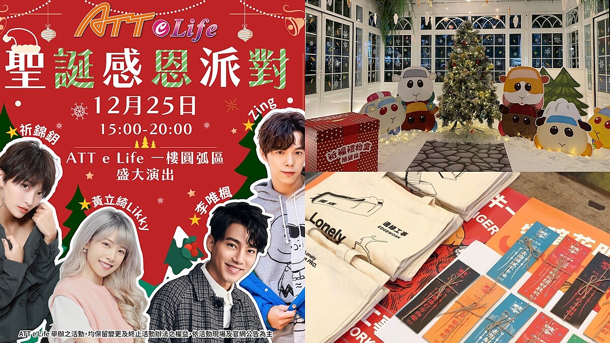 位於大直的ATT e Life將打造大直最嗨耶誕城!12/11起每個周末都有主題市集,12/25更會舉辦「聖誕感恩派對」,會有李唯楓、黃立綺 Likky、祈錦鈅、Zing等歌手演出。12/31~2022/1/2舉辦「勇者應援團!出動吧!」跨年系列活動,超過35組為連假時期一起注入滿滿活力、迎接嶄新一年。