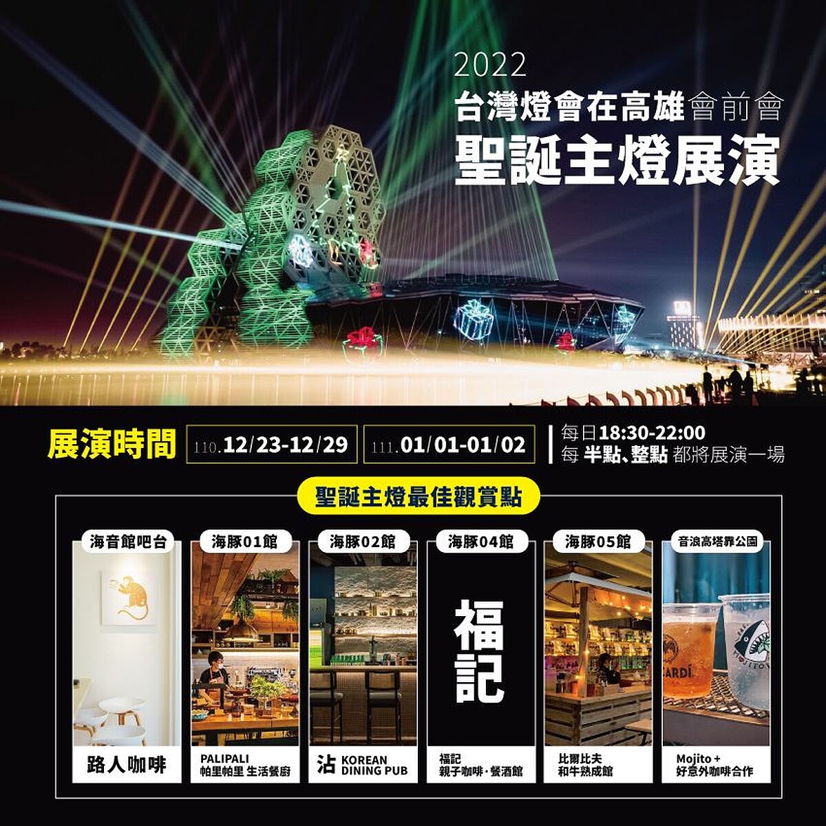 全台最大聖誕樹年底壓軸登場!史無前例的「2022台灣燈會在高雄會前會」於12/3~1/2起跑,高雄市政府將愛河灣(高流海音館到愛河沿岸)打造成全台最大聖誕光影展演舞台,邀請演唱會指定燈光設計「鹿米工作室」、結合賴雨農設計師、張德銘創作音樂,每天18:30至22:00、每半小時展演一場。最佳觀賞點的高流場域及海豚步道還推出快閃店,能品嚐在地美食及特色餐酒館進駐,美景配美食為2021年底畫下好句點。