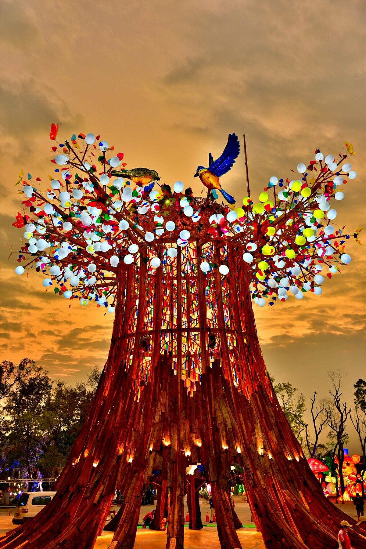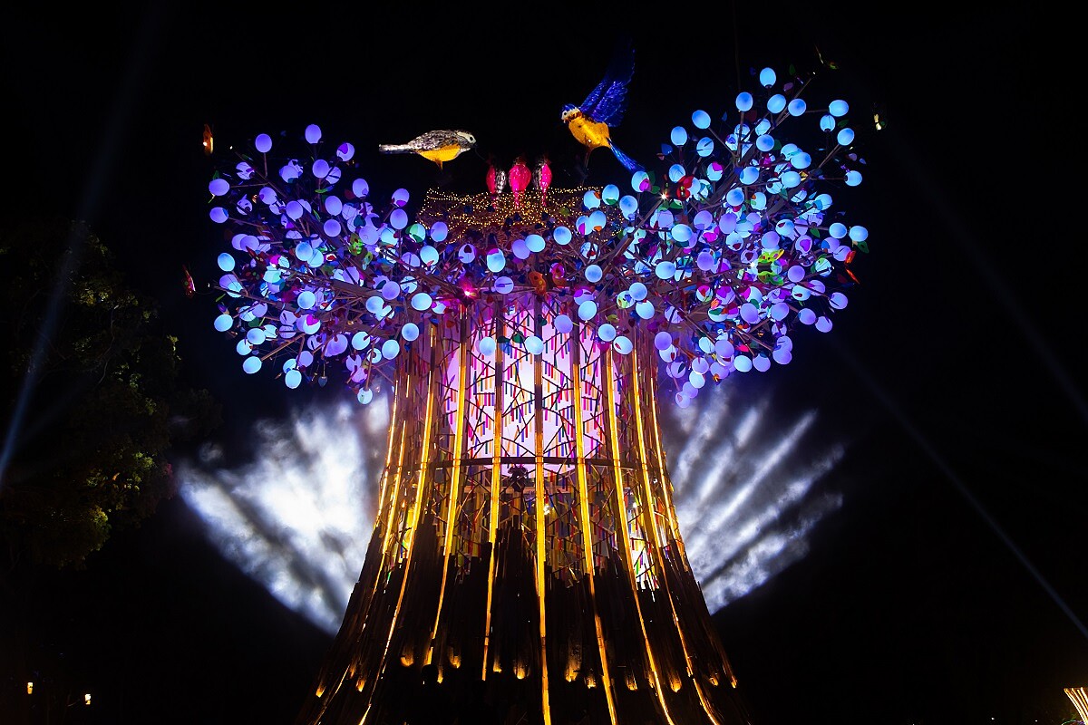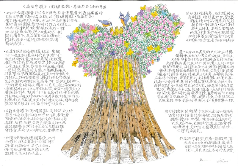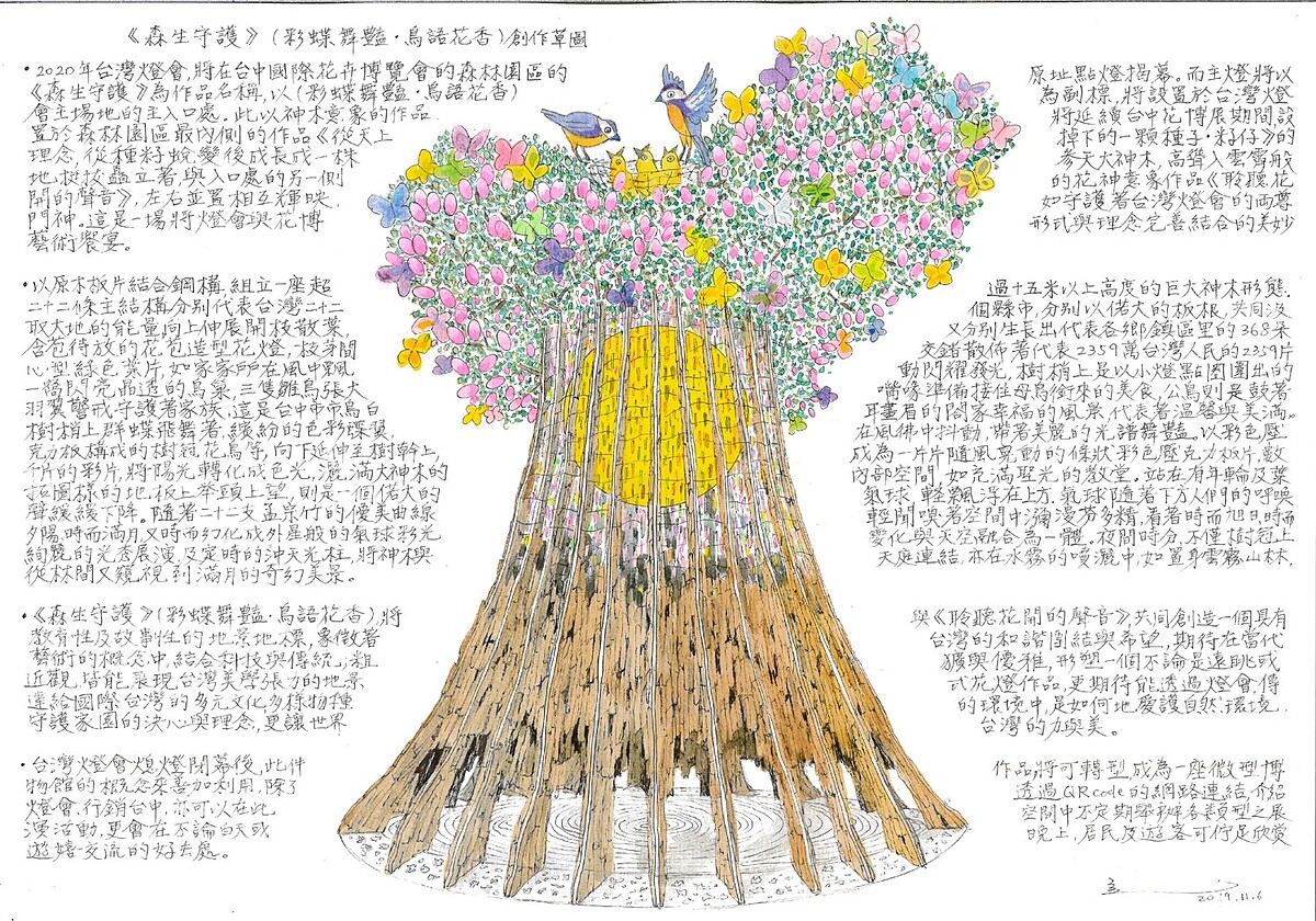 隆重盛大的台灣年度元宵燈會,近年持續於各大城市舉行。長年致力於環境與公共藝術的林舜龍和他所帶領的達達創意團隊,即為2020年在台中舉辦的台灣燈會打造主燈—《森生守護· 光之樹》。作品具有高聳壯闊的樹木造型,內含一顆象徵種籽、滿月、旭日的巨型圓燈,直入雲霄的樹梢更綴滿繽紛小燈、彩蝶與飛鳥,令人目不暇給。