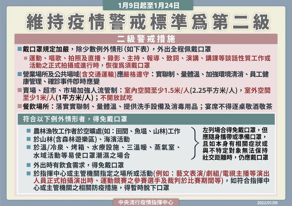 Omicron襲台,桃園機場群聚感染可是連環爆,中央流行疫情指揮中心最新表示從1月9日至24日維持第二級疫情警戒標準,就連戴口罩的相關規定也做了調整,像是唱歌、運動等活動恢復必須戴口罩,5大例外情形可不用戴。